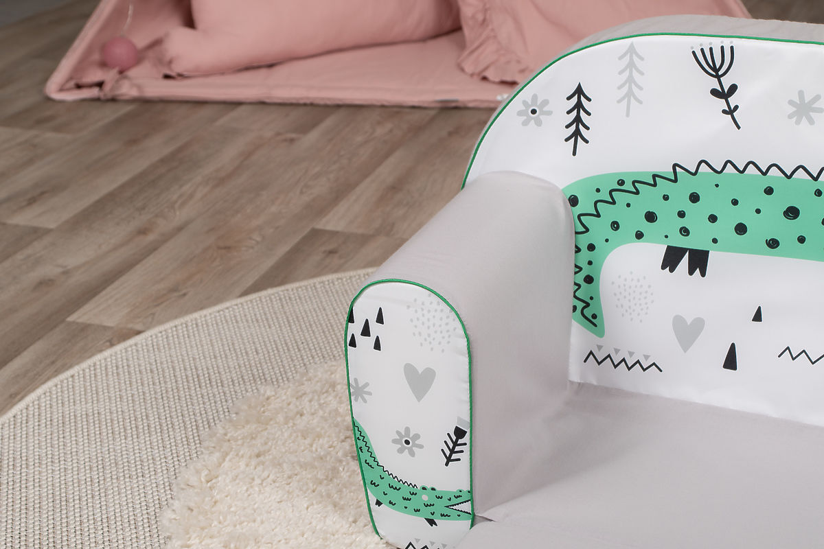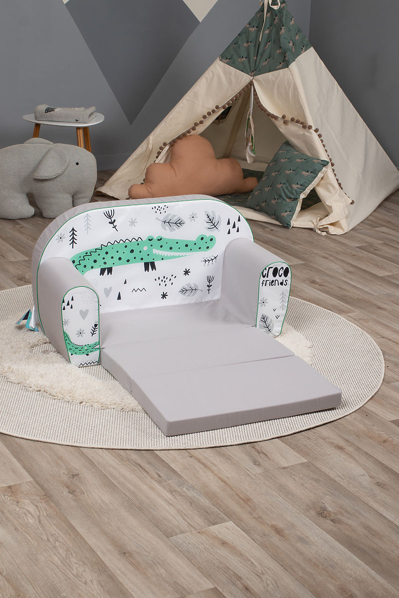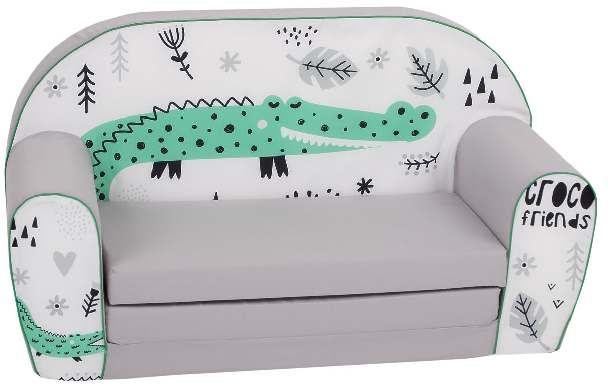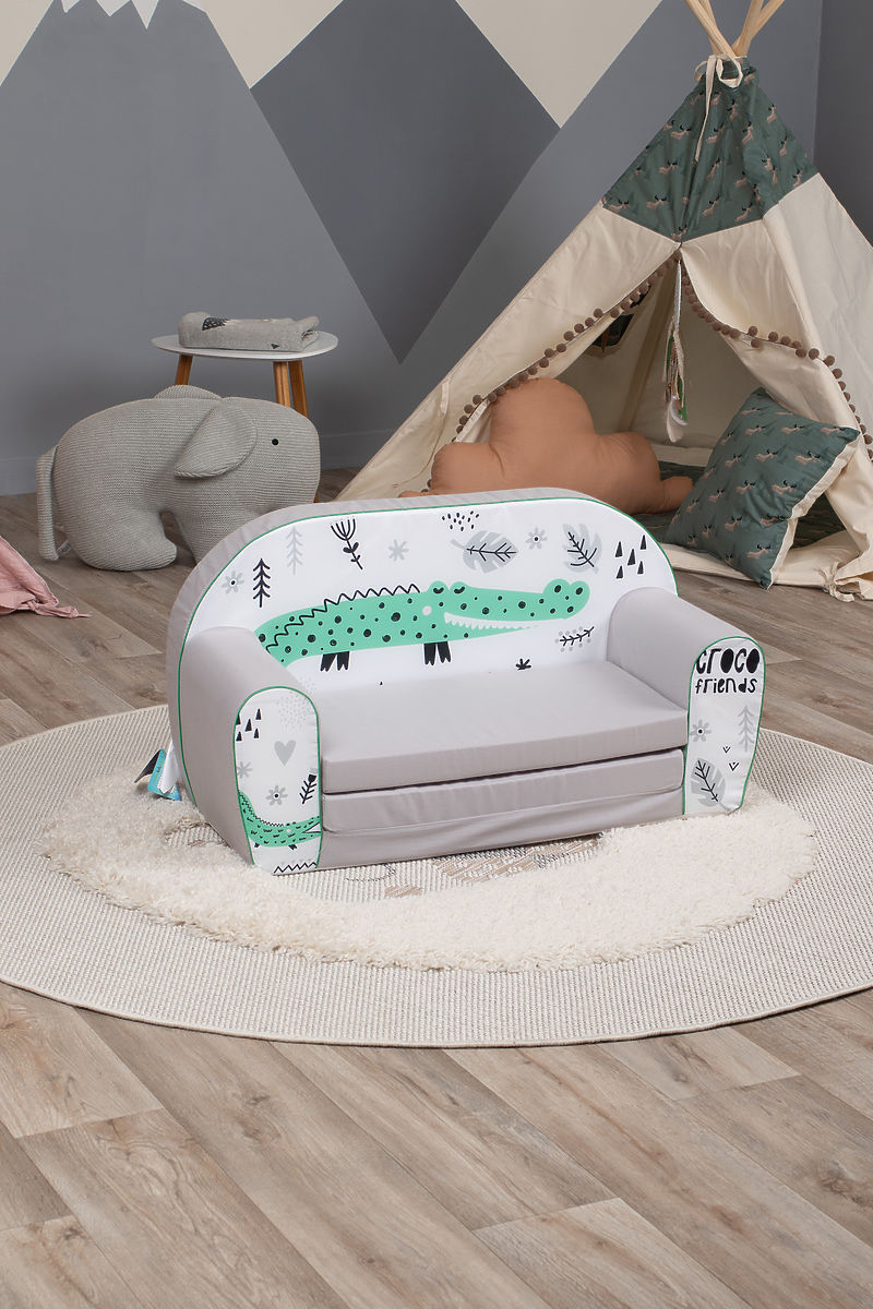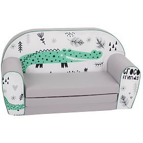 Canapea alb-gri cu crocodil verde. Pe partea din față se află inscripția prietenilor Croco . Canapeaua pentru copii este din spumă moale și ușoară. Acest lucru asigură că este sigur și practic pentru utilizarea de zi cu zi.