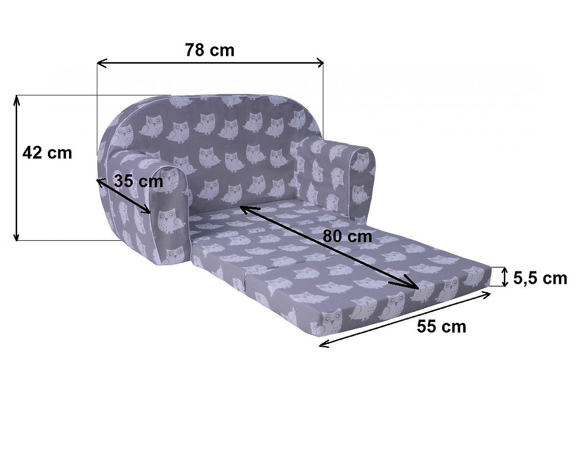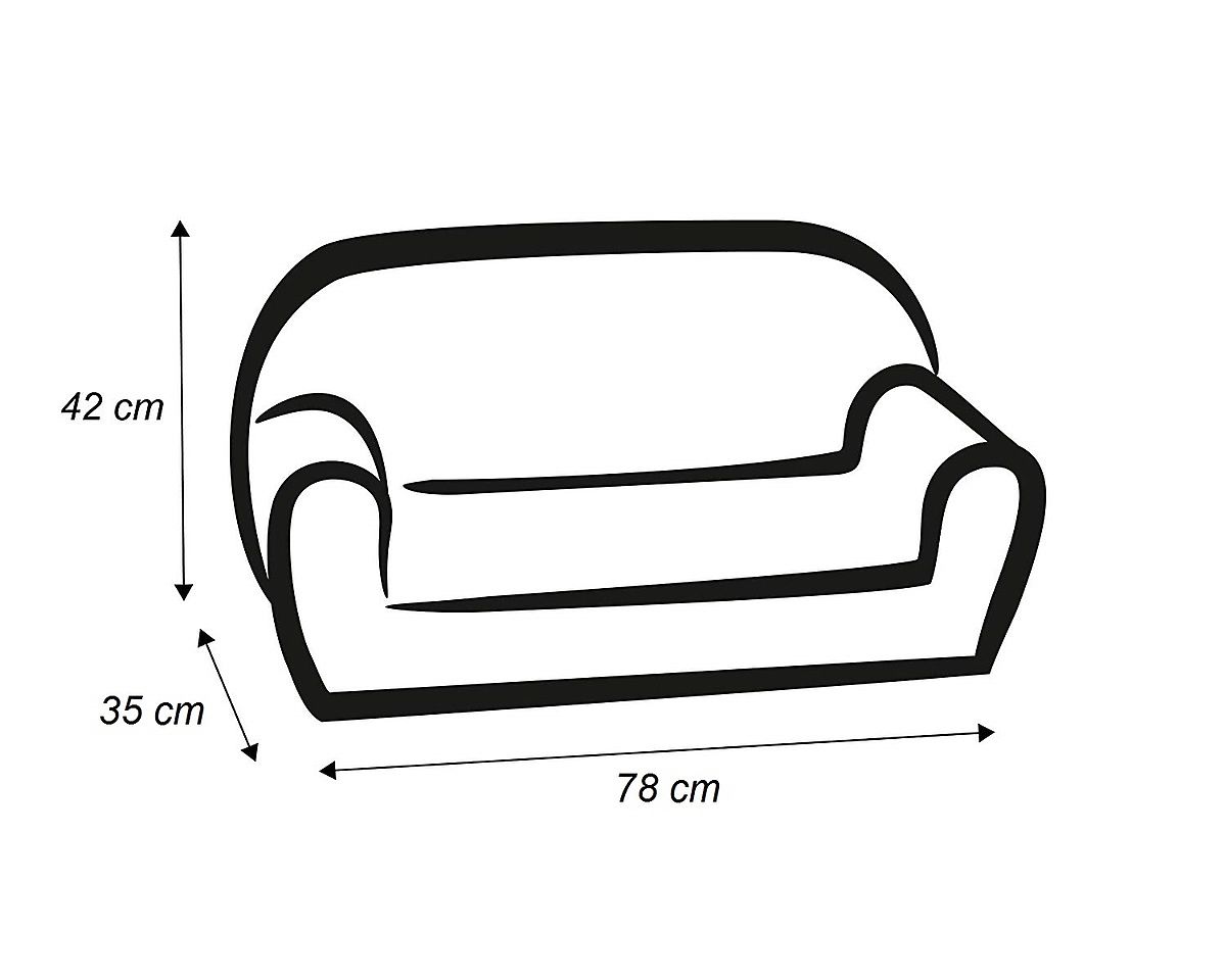Canapeaua pentru copii are o lățime de 78 cm, ceea ce este doar pentru doi copii. Înălțimea totală a canapelei este de 42 cm. Adâncimea canapelei este de 35 cm, dar când sunt desfășurați, copiii obțin un spațiu suplimentar de până la 80 cm în total.