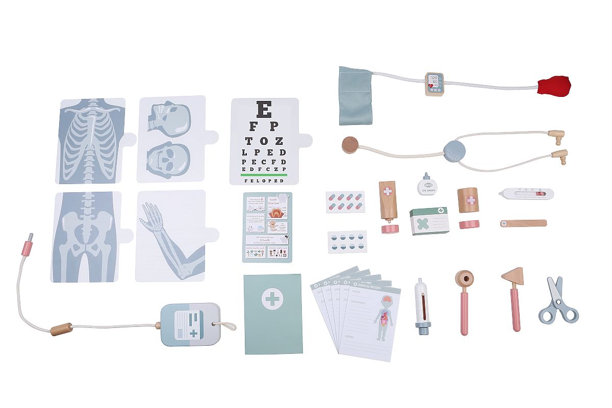 Joaca cu acest set nu este doar o distracție grozavă, ci și o învățare. Copiii învață empatie, cum să scape de frică, responsabilitate și îngrijirea altora. Această jucărie stimulează imaginația, permite descoperirea misterelor profesiei de medic și învață recunoașterea instrumentelor necesare pentru această muncă. În plus, jocul formează abilități manuale. Cunoști înălțimea pacientului tău? Nu? Atunci măsoară-l! Măsoară-i și tensiunea sau temperatura, ascultă-l și notează totul cu atenție în fișa pacientului. Poți, de asemenea, să verifici vederea sau auzul și nu uita să te uiți la radiografiile pe o placă iluminată funcțională! Setul include o masă pentru examinări și intervenții cu spațiu de depozitare și instrumentele necesare pentru munca de medic. Stetoscop, tensiometru, termometru, pensetă, cutii pentru medicamente și creme, foarfece, perfuzie, 4 radiografii, otoscop, seringă, ciocănel, fișe de pacienți, carduri cu medicamente, tabel pentru verificarea vederii și pliante informative. Principalele caracteristici: conține 30 de piese spital din lemn cu accesorii ajută la dezvoltarea imaginației, vorbirii și abilităților sociale îmbunătățește abilitățile de comunicare și motorii dezvoltă fantezia și creativitatea placă funcțională pentru iluminarea radiografiilor - 2xAAA baterii nu sunt incluse