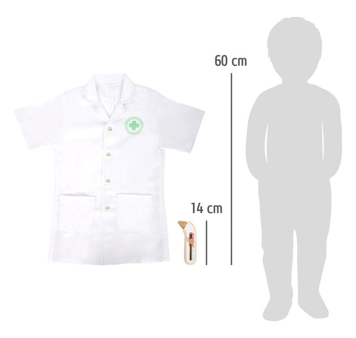 Set complet de joacă cu halat de medic și echipament medical. Include o seringă, un stetoscop și un termometru din lemn robust. Pistonul seringii se retrage la apăsare. Termometrul are un indicator de temperatură reglabil. Halatul de medic are două buzunare practice și se închide cu capse, astfel încât tinerii medici să-l poată îmbrăca și dezbrăca rapid. Jucărie perfectă pentru jocuri de rol sau ca costum de carnaval. Potrivit pentru copii cu înălțimea de 105-110 cm (mărimea 110). Accesoriu ideal pentru geanta de doctor și alte produse similare. Principalele caracteristici: halat de medic și alte accesorii pentru copii cu înălțimea de 105-110 cm, perfect pentru jocuri de rol sau carnaval.