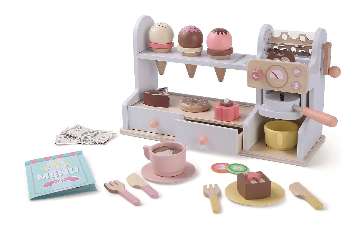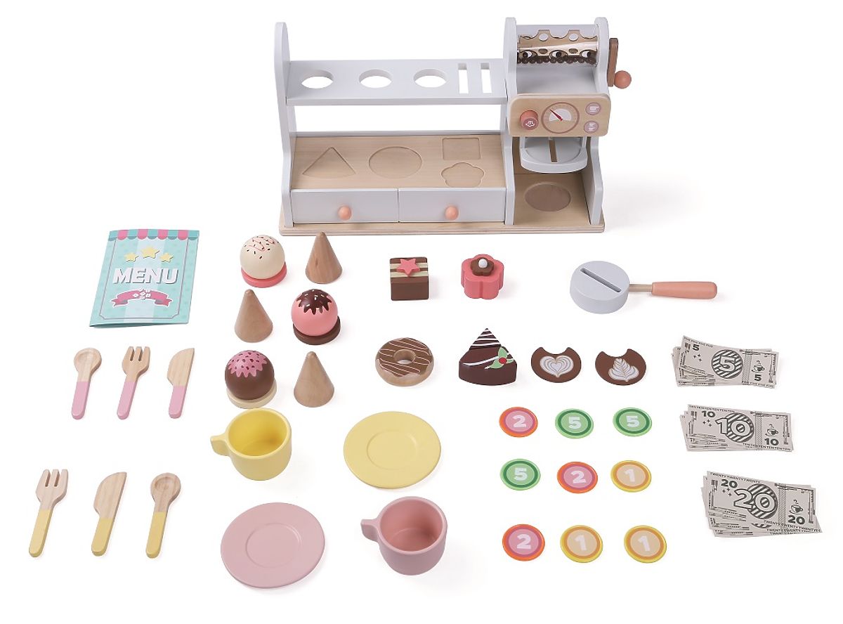 Devino un adevărat barista sau comerciant! Doriți înghețată, prăjitură sau doar o cafea delicioasă? Cu acest set de 46 de piese, veți petrece ore întregi de distracție. Setul oferă cești cu farfurioare, tacâmuri și linguri, un tejghea cu aparat de cafea, o vitrină cu prăjituri și un raft cu găuri pentru înghețate. Nu lipsesc nici sertarele cu spațiu de depozitare pentru bani, care sunt, de asemenea, parte a acestui set. Jucăriile de rol stimulează imaginația copiilor și îi inspiră la jocuri creative, având un impact pozitiv și asupra vocabularului și dezvoltării limbajului lor. Principalele caracteristici: conține 46 de piese, susține dezvoltarea limbajului și a vocabularului