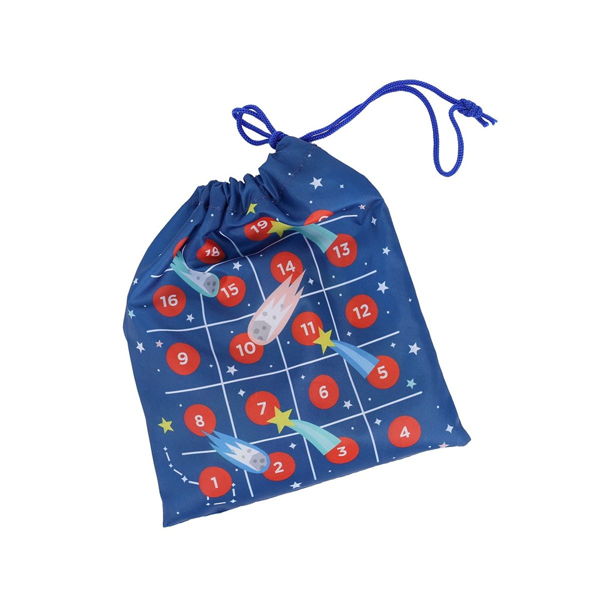 Călătorește prin galaxie cu două jocuri preferate! Jocul de călătorie 2 în 1 Aventură Spațială este o versiune a jocurilor clasice amuzante X și 0 și șerpi și scări. Jocul include 10 piese din lemn în formă de rachete și planete, un zar și instrucțiuni de joc. Jucătorii mută planetele și rachetele pe grilele imprimate pe un săculeț de călătorie practic, cu șnur și motive spațiale. Când un jucător ajunge pe un câmp cu o cometă, avansează o linie mai sus, iar un câmp cu un meteorit căzător îl readuce o linie mai jos. Jocurile sunt o modalitate excelentă de a învăța copiii răbdarea, concentrarea, comunicarea cu alți jucători, cum să câștige, dar și să piardă. Pentru copiii mai mici, mișcarea pieselor pe tabla de joc este un exercițiu excelent de coordonare mână-ochi, dexteritate și recunoașterea culorilor și formelor. Toate componentele jocului sunt fabricate din materiale reciclate. Săculețul este din PET reciclat, șnurul din PP reciclat și piesele din lemn reciclat. Principalele caracteristici: 2 jocuri într-un ambalaj de călătorie practic, versiuni ale jocurilor preferate X și 0 și șerpi și scări, învață răbdarea, concentrarea, câștigul și pierderea, dezvoltă coordonarea mână-ochi, susține recunoașterea culorilor și formelor, pentru 2 jucători, potrivit pentru copii de la 4 ani.