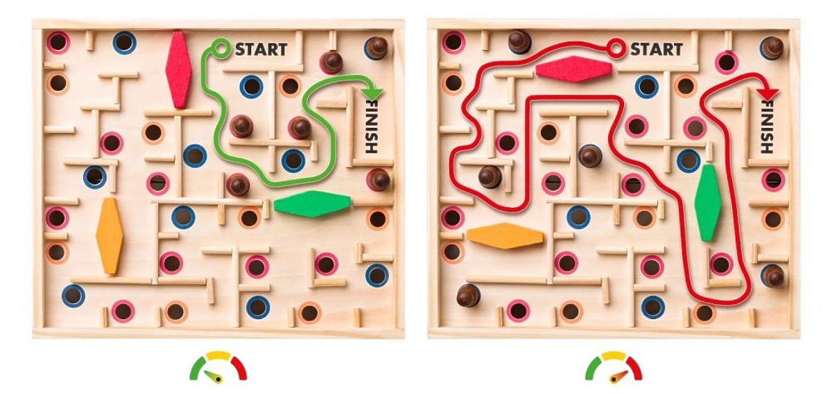 Principiul de funcționare este foarte simplu - trebuie să conduceți bila de la câmpul de start marcat cu inscripția "START" la câmpul de sosire marcat cu inscripția "FINISH". Și aici se termină simplitatea acestui joc distractiv, deoarece bila se mișcă foarte ușor prin labirint și cade ușor în găuri - și asta trebuie evitat. De-a lungul întregului labirint sunt amplasate găuri. Adesea sunt colțuri sau locuri unde va fi necesară o manevră, ceea ce face jocul și mai dificil. Din fericire, setul include 6 figurine cu care puteți bloca găurile "cele mai urâte" sau orice altele. Numărul de figurine folosite este la alegere, în primele jocuri puteți folosi toate sau un număr mai mare. Odată ce câștigați experiență, puteți reduce treptat numărul de figurine sau le puteți elimina complet și introduce un nou nivel de joc "hardcore" :)