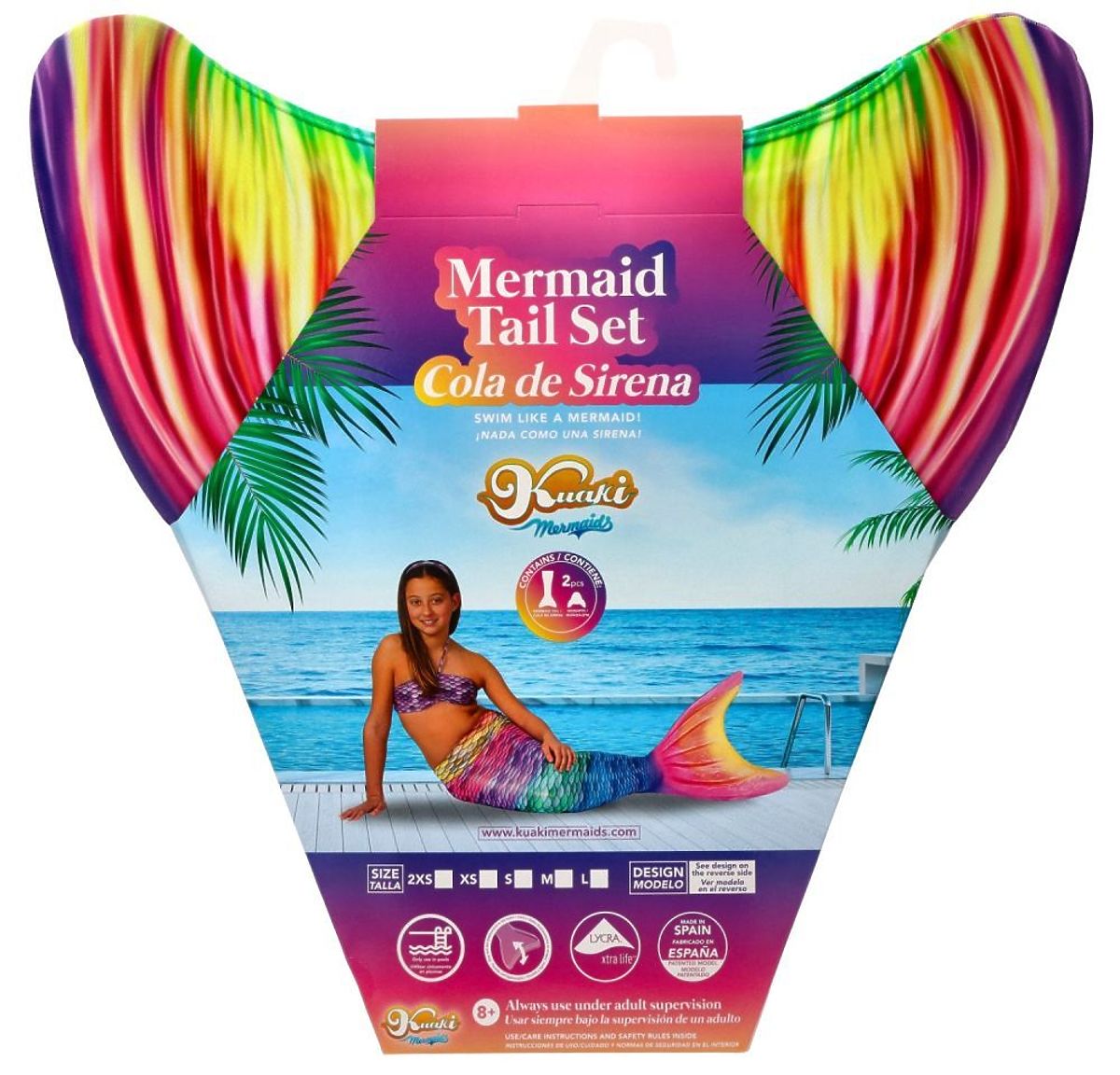 Coada de mare este fabricată în Spania din Lycra Xtra Life de înaltă calitate, ceea ce garantează o aderență optimă și confort în utilizare. Designul care include solzi de pește, culori strălucitoare și efect 3D oferă produsului un aspect realist. Disponibilă în multe culori, modele și dimensiuni pentru toate vârstele.