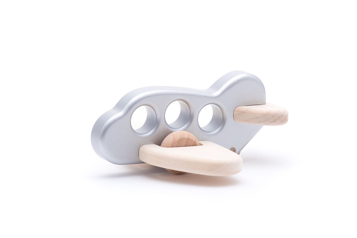Avion din lemn cu trei ferestre, care servesc și ca mâner pentru o mână mică. Forma, curbura și dimensiunile corect alese ale deschiderilor permit copilului să descopere prinderea cu degetele și să recunoască formele. Fiecare mișcare a jucăriei, cum ar fi împingerea, rostogolirea, deplasarea pe curbele mobilierului sau desenarea liniilor în aer, ajută copilul să descopere spațiul și dinamica ascunsă în corp. Jocul cu avionul dezvoltă astfel motricitatea grosieră. Recomandăm curățarea suprafeței jucăriei doar cu o cârpă umedă. Vă rugăm să nu expuneți această jucărie la temperaturi ridicate sau umiditate mare, deoarece lemnul se poate îndoi și deforma în aceste condiții. Îndeplinește toate standardele de siguranță europene. Caracteristici principale: fabricat din resurse naturale, ușor reciclabil, design Wojciech Bajor, potrivit pentru prinderea de o mână mică, dezvoltă motricitatea grosieră.