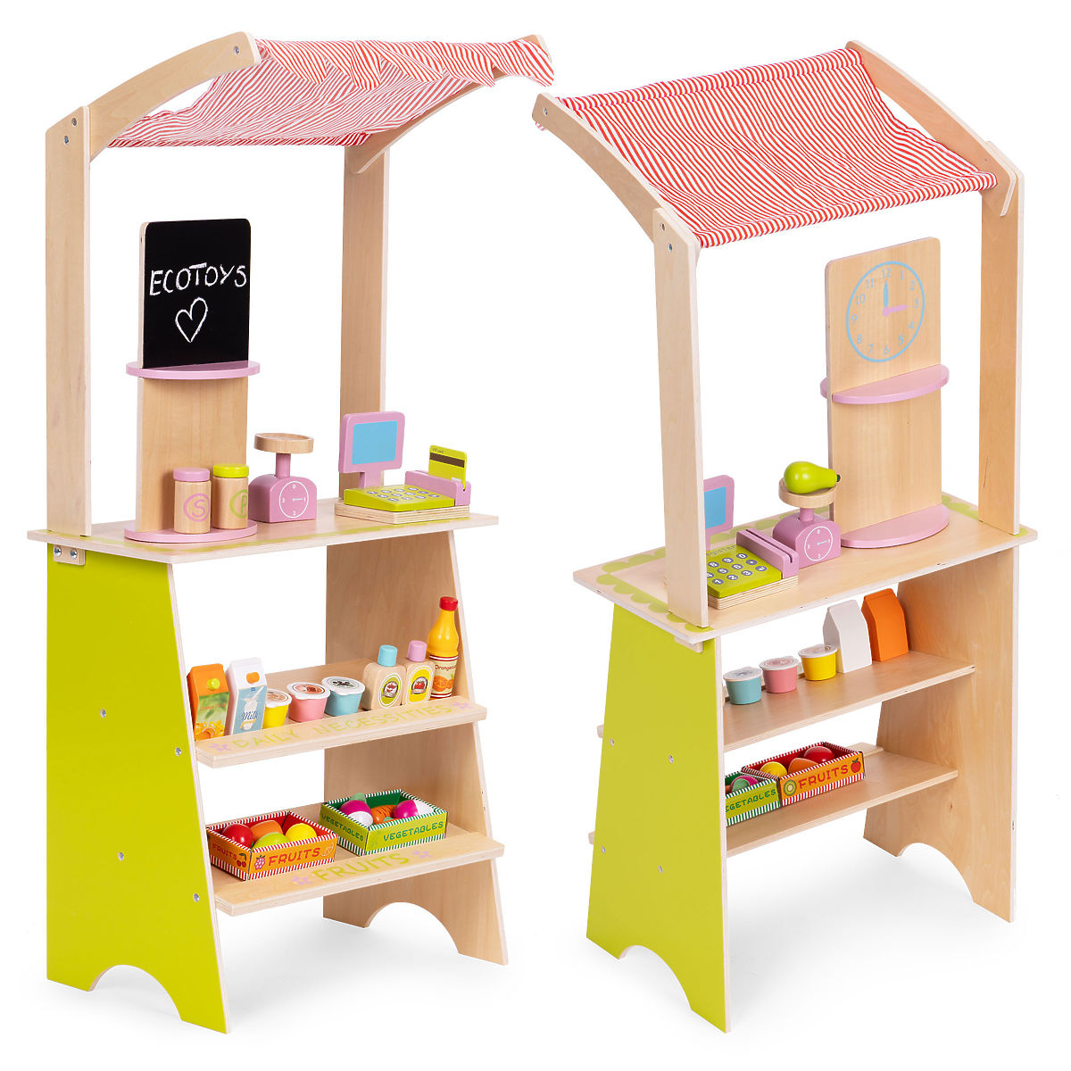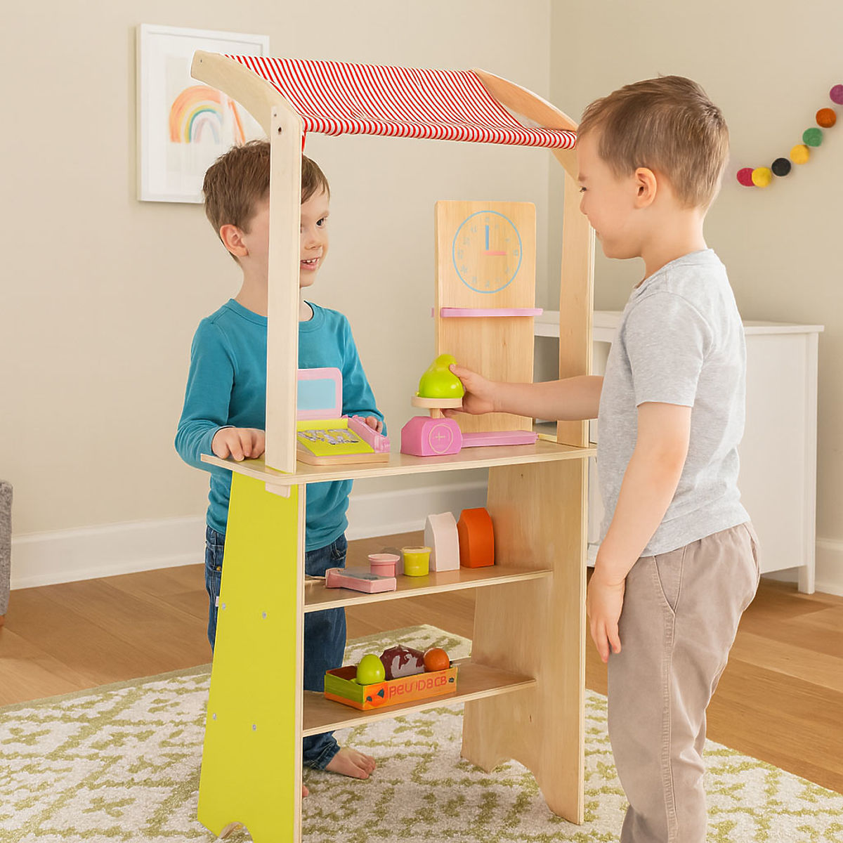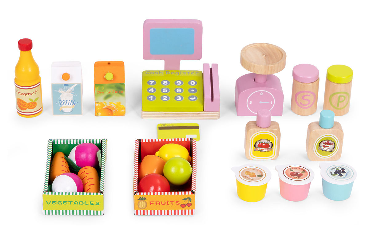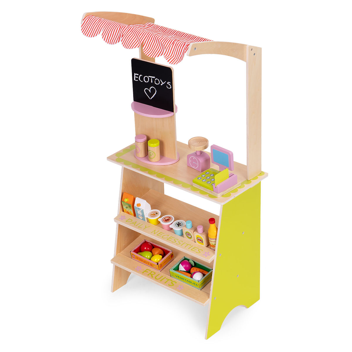 Standul din lemn ECOTOYS încurajează copiii să participe activ în jocuri de rol, învățând comportamente sociale de bază, precum cumpărăturile, vânzarea și calculul. Jucăria este ideală atât acasă, cât și la grădiniță sau în sala de joacă. Este un instrument excelent pentru învățarea cooperării, comunicării și gândirii creative. Datorită prezenței casei de marcat, terminalului, cântarului și numeroaselor produse alimentare, jocul devine realist și captivant. Produsul dezvoltă coordonarea mână-ochi, stimulează imaginația și încurajează copilul să acționeze independent.