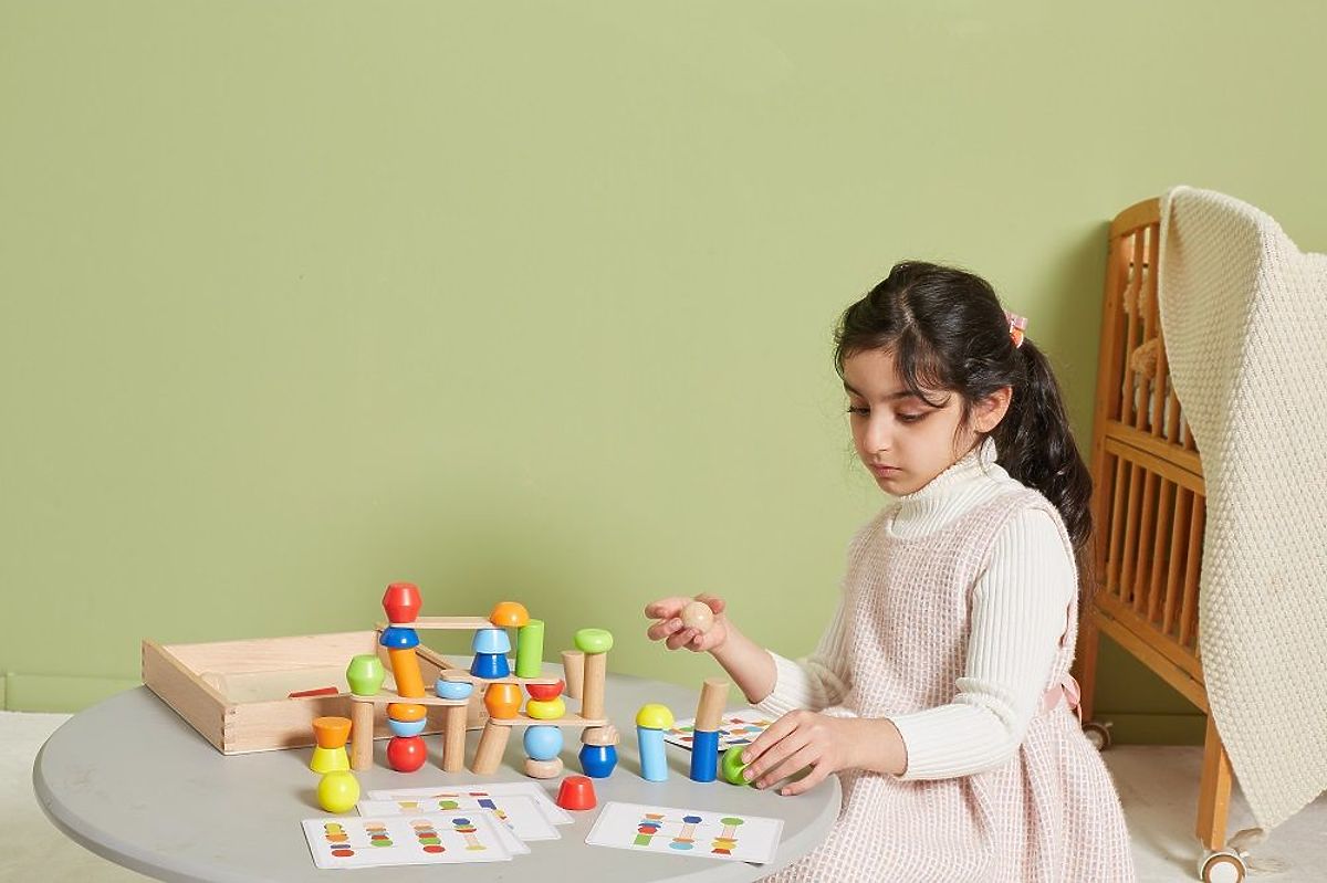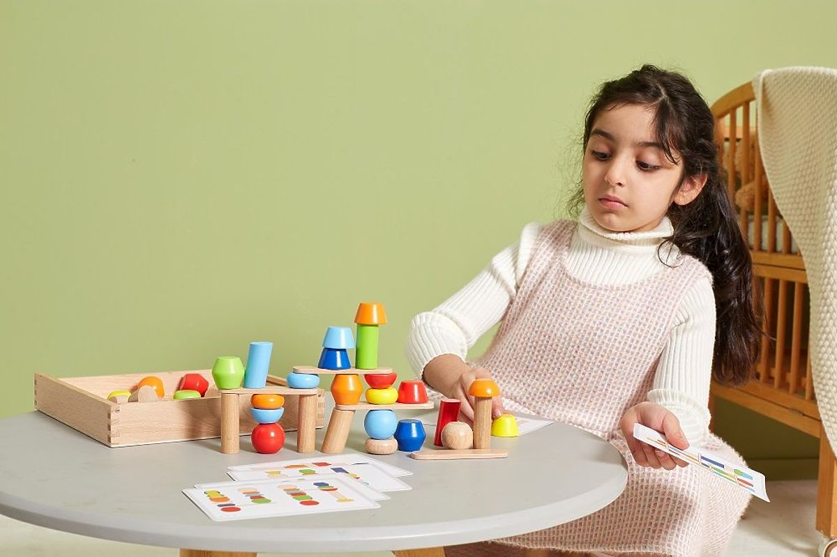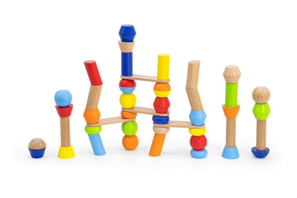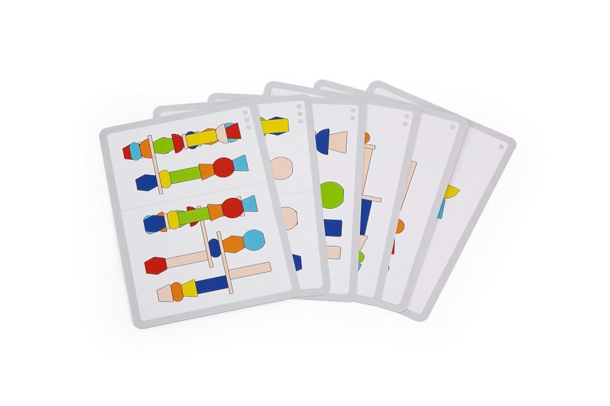 Puzzle-ul tradițional de turn acum într-un design ușor diferit, cu forme și culori variate. Această jucărie nu este doar un timp plăcut petrecut, ci și o oportunitate de a învăța despre forme, culori, dimensiuni și diverse combinații ale acestor elemente. Copilul poate construi turnuri după propria imaginație sau poate folosi cărțile incluse cu trei niveluri de dificultate. Construirea turnurilor din blocuri dezvoltă abilități manuale și stimulează imaginația și creativitatea. Distracția de succes este garantată!