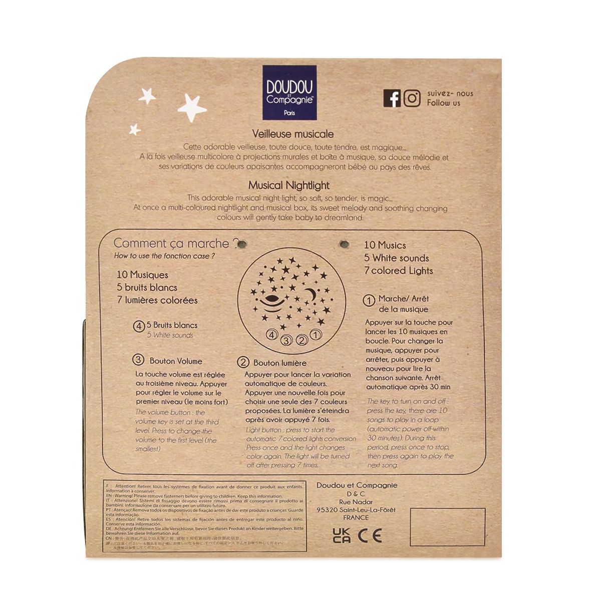 Cine nu doarme încă aici? Cu acest iepuraș adorabil, adormirea copilului dumneavoastră va fi o joacă de copii. Iepurașul din material moale este potrivit pentru îmbrățișări și are pe burtică o cutiuță muzicală cu proiecție a universului în 7 culori. Redă 10 melodii blânde și 5 sunete liniștitoare care vor legăna bebelușul dumneavoastră și îi vor susține relaxarea și somnul de calitate. Cu ajutorul a 4 butoane, este posibil să setați volumul și diferite moduri de redare a melodiilor și modurile de culoare individuale. Puteți alege modul automat, în care melodiile sunt redate în mod repetat, sau puteți selecta o piesă specifică. De asemenea, puteți seta modul automat de lumină, în care culorile se schimbă treptat, sau puteți alege culoarea preferată. Stimularea vizuală și auditivă ajută la dezvoltarea senzorială a copilului. Această cutiuță muzicală cu proiecție este un cadou minunat pentru orice copil încă de la naștere. Întreținere: Spălați iepurașul în baie la 30° (scoateți mecanismul muzical înainte de spălare). Uscați natural sau la temperatură scăzută. Principalele caracteristici: jucărie de pluș și cutiuță muzicală cu proiecție într-un singur produs, cutiuța muzicală este detașabilă pentru o întreținere ușoară, stimulare vizuală și senzorială, pluș moale, conform normelor europene CE, potrivit ca cadou sau accesoriu pentru camera copilului, alimentat de 3 baterii AAA/R03 (nu sunt incluse) de la naștere.