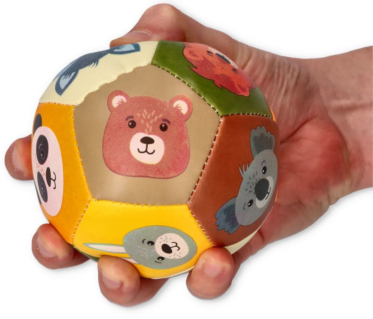 Mingea cu animale sălbatice în nuanțe delicate de bej și maro este o propunere de jucărie simplă, clasică, pe care toată lumea o cunoaște și o îndrăgește. În ciuda simplității sale, dezvoltă motricitatea și încurajează activitatea. Dimensiunea sa este ideală pentru mâinile mici - copilul o poate strânge, apăsa și arunca. Jucându-se cu mingea, copilul învață să distingă culorile și își dezvoltă motricitatea mâinii. Datorită imaginilor care prezintă animale, copilul învață într-un mod interesant numele acestora. În timpul jocului cu mingea, copilul învață cooperarea și competitivitatea sănătoasă. Țesătura de poliester durabilă este extrem de moale la atingere, ideală pentru primele jocuri cu mingea.