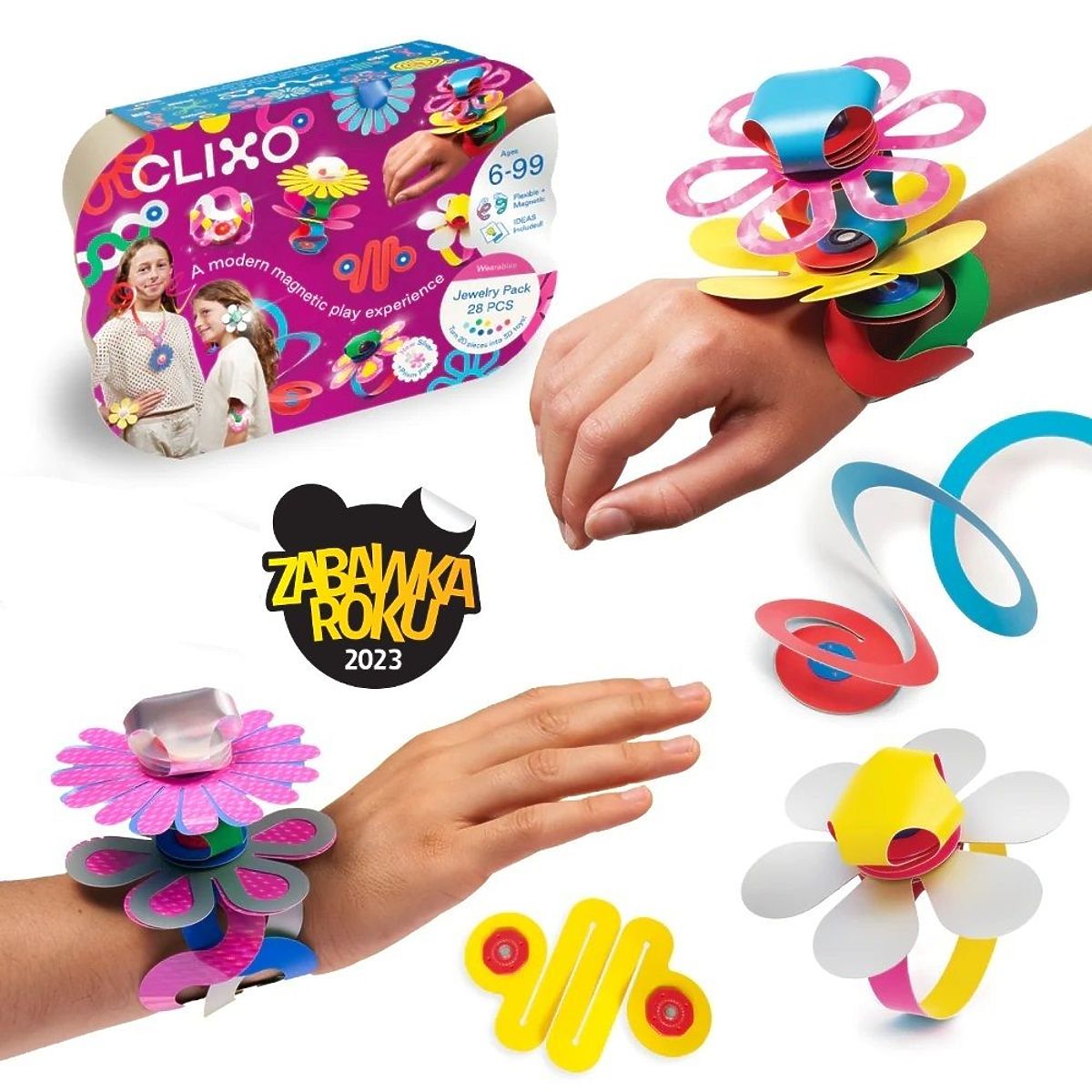Străluciți cu acest set de construcție magnetică pentru confecționarea bijuteriilor Clixo! Florile, prismele și pandantivele special concepute vor înviora proiectele dumneavoastră de bijuterii. Fie că sunteți acasă sau pe podium, elementele magnetice flexibile Clixo inspiră încredere creativă. Creați de la coliere strălucitoare la brățări elegante și acoperitoare de cap. Lăsați-vă imaginația să strălucească și descoperiți puterea distracției cu Clixo.