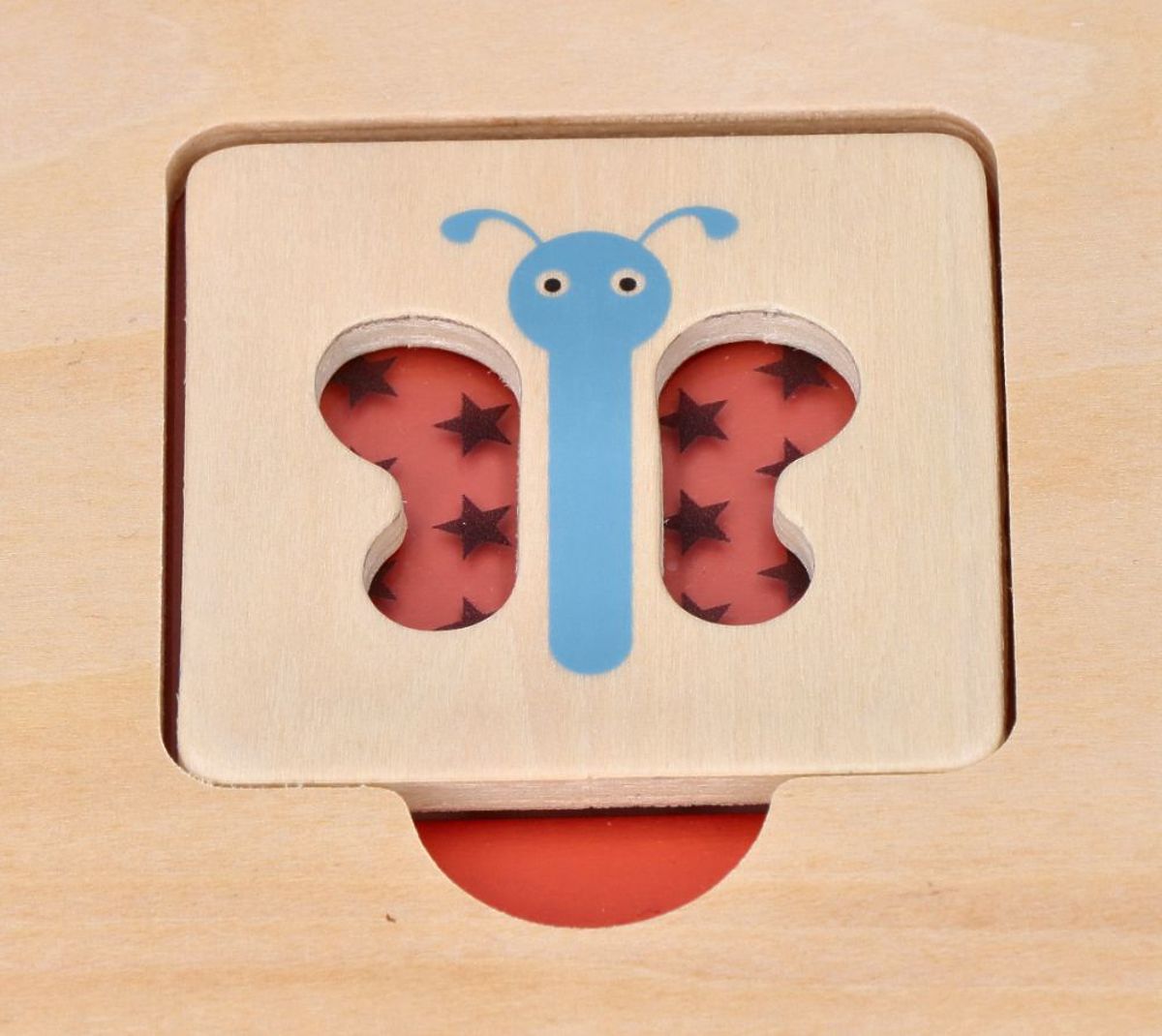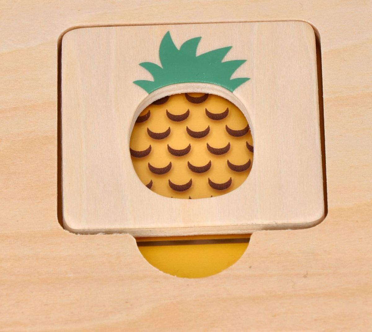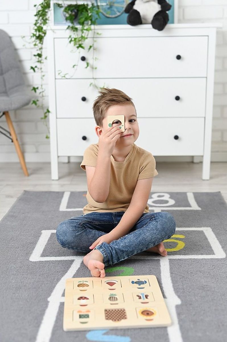 Cum funcționează? Aceste puzzle-uri constau într-o bază cu nouă ferestre în culori diferite. Avem nouă plăcuțe de lemn cu forme decupate, pe care le putem muta liber pentru a obține aceleași imagini în culori diferite, dar asta nu este tot. Cea mai mare distracție o aduc plăcuțele transparente cu modele. După introducerea plăcuței în fereastră, obținem nu doar culoarea, ci și modelul. Abia acum, când adăugăm plăcuța cu forma, apare de exemplu un pepene cu semințe sau o ciupercă cu puncte. Și ce se întâmplă când schimbăm modelele? Aici ne așteaptă cea mai bună distracție. Se dovedește că modelul ananasului, după o rotire de 90 de grade, imită perfect solzii unui pește. Există cu adevărat multe opțiuni. Datorită acestui fapt, această mică jucărie este potrivită și pentru călătorii. Descoperiți câte soluții creative aduce cu ea.