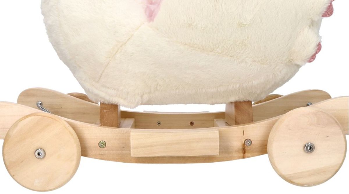 Transformarea calului de leagăn într-un vehicul se face foarte ușor prin plierea roților sub tălpi și fixarea curelei. Astfel, copilul se poate deplasa sau își poate trage calul de leagăn cu el.