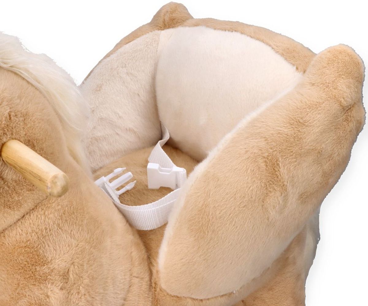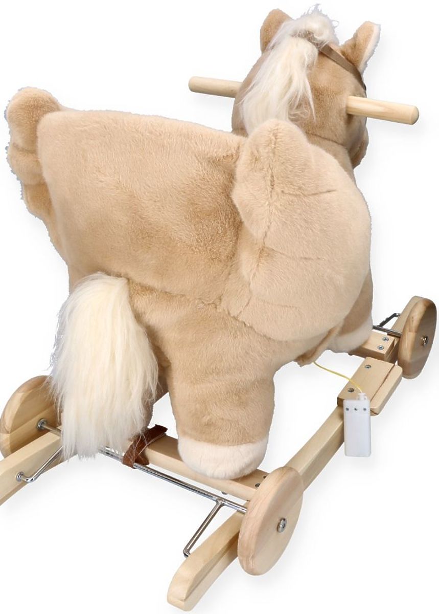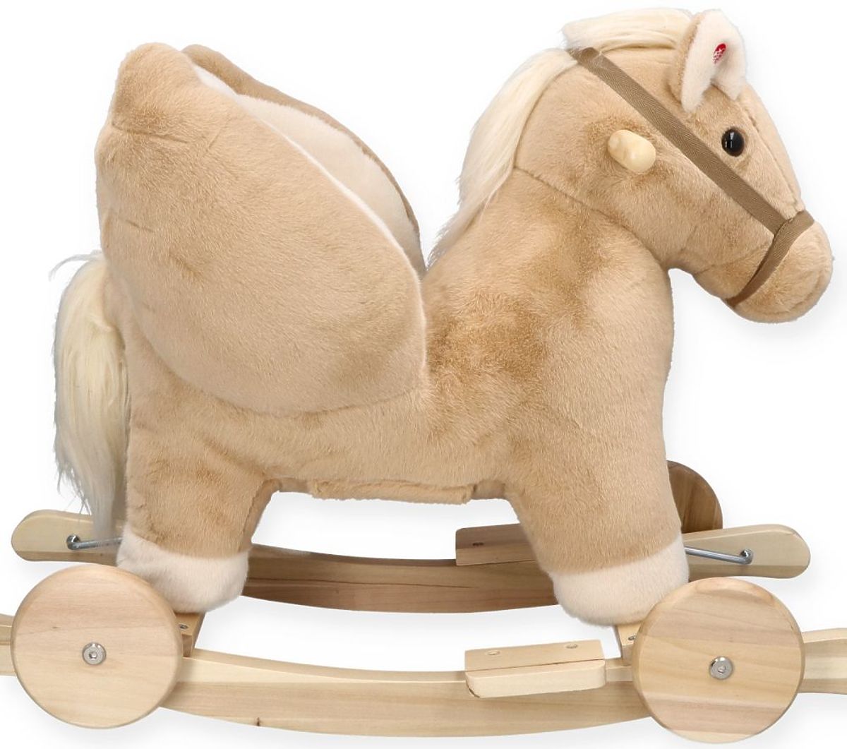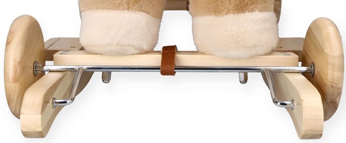 Pegasul este realizat dintr-un material plușat moale și plăcut la atingere, de culoare bej delicat. Tălpile și mânerele sunt realizate din lemn de culoare naturală, ceea ce se potrivește perfect cu conceptul general. Prietenul nostru plușat are roți de lemn, care permit ca, în funcție de aranjamentul lor, să fie un leagăn sau un vehicul de împingere. Transformarea din vehicul de împingere în leagăn este foarte ușoară. Nu este nevoie să demontați nimic, trebuie doar să desfaceți o curea specială și să rotiți roțile pe cealaltă parte a tălpilor. Gata!