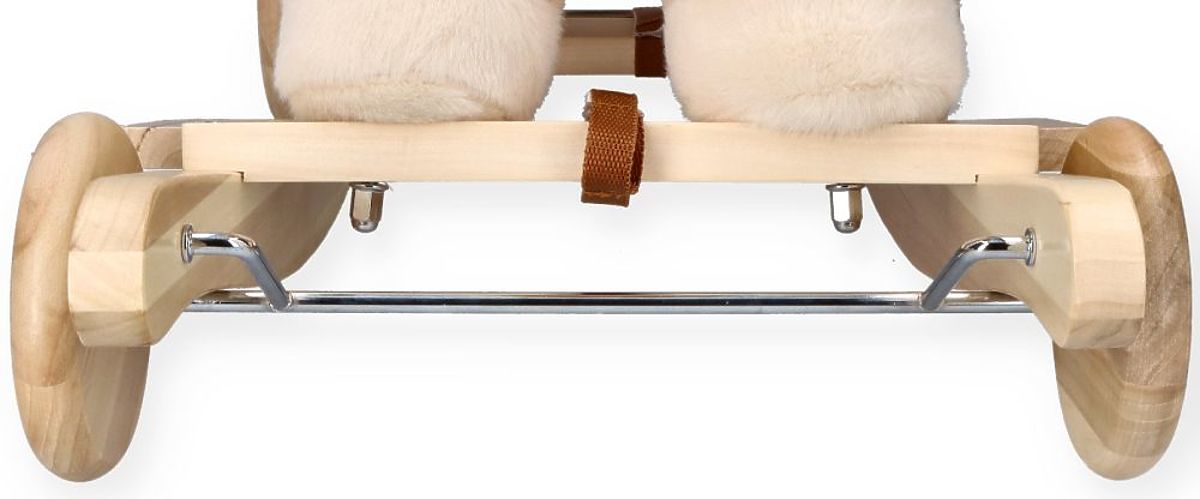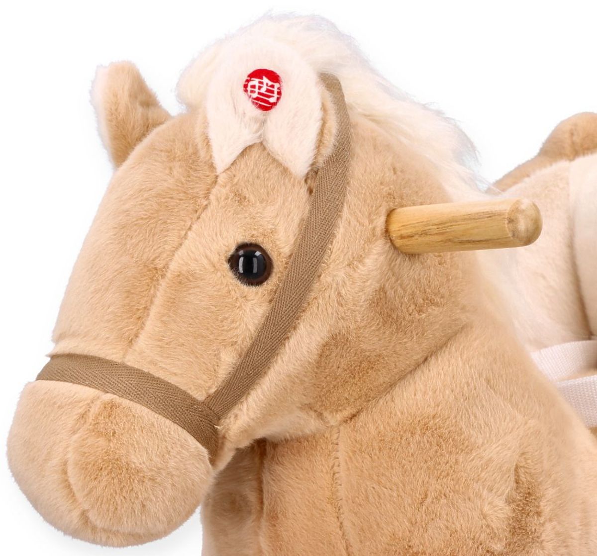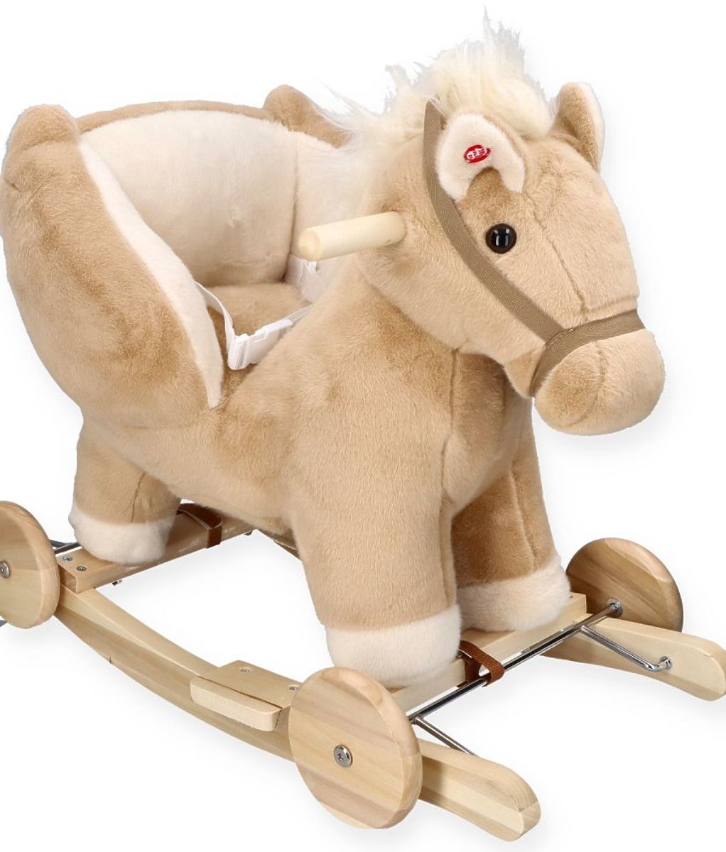Pegasul este realizat dintr-un material plușat moale și plăcut la atingere, de culoare bej delicat. Tălpile și mânerele sunt realizate din lemn de culoare naturală, ceea ce se potrivește perfect cu conceptul general. Prietenul nostru plușat are roți de lemn, care permit ca, în funcție de aranjamentul lor, să fie un leagăn sau un vehicul de împingere. Transformarea din vehicul de împingere în leagăn este foarte ușoară. Nu este nevoie să demontați nimic, trebuie doar să desfaceți o curea specială și să rotiți roțile pe cealaltă parte a tălpilor. Gata!