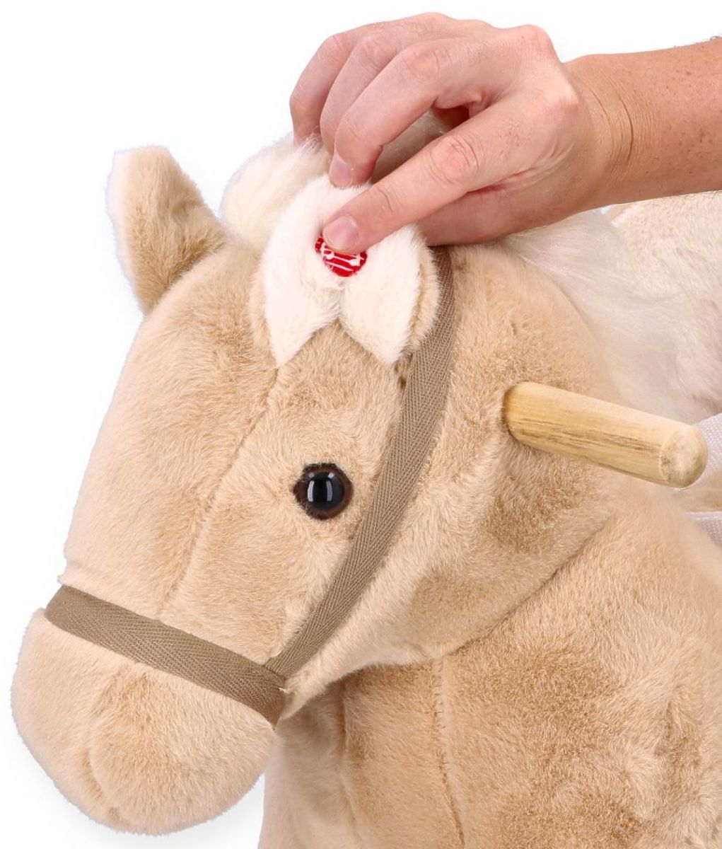 Jucăria necesită două baterii de tip AA. Buzunarul cu baterii este ascuns sub burta calului.