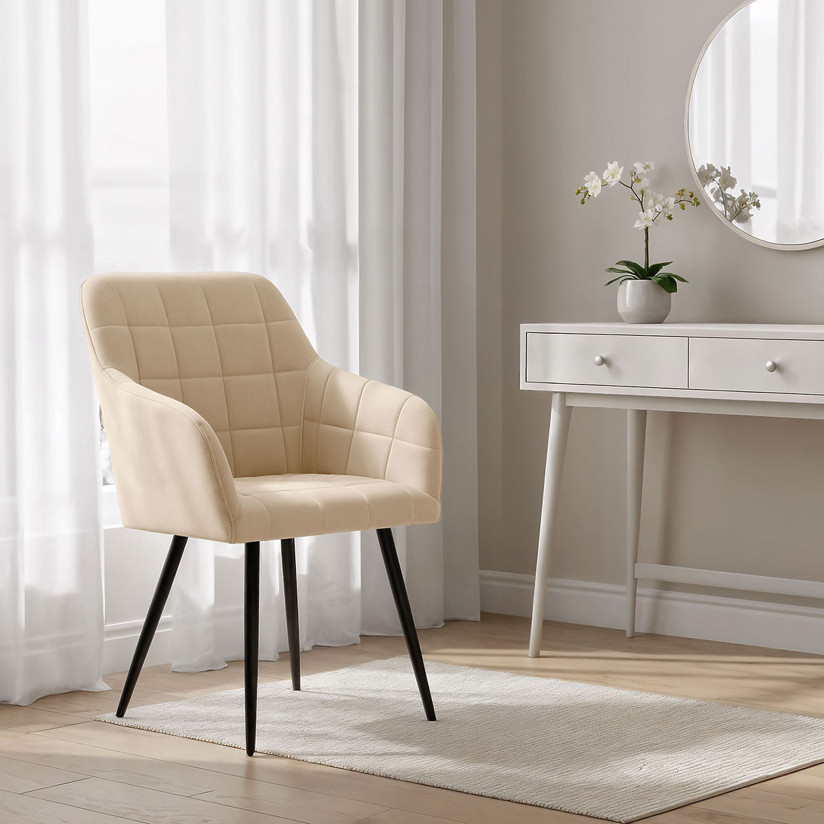 Scaun tapițat bej cu cusături pătrate și picioare negre. .. mai mult