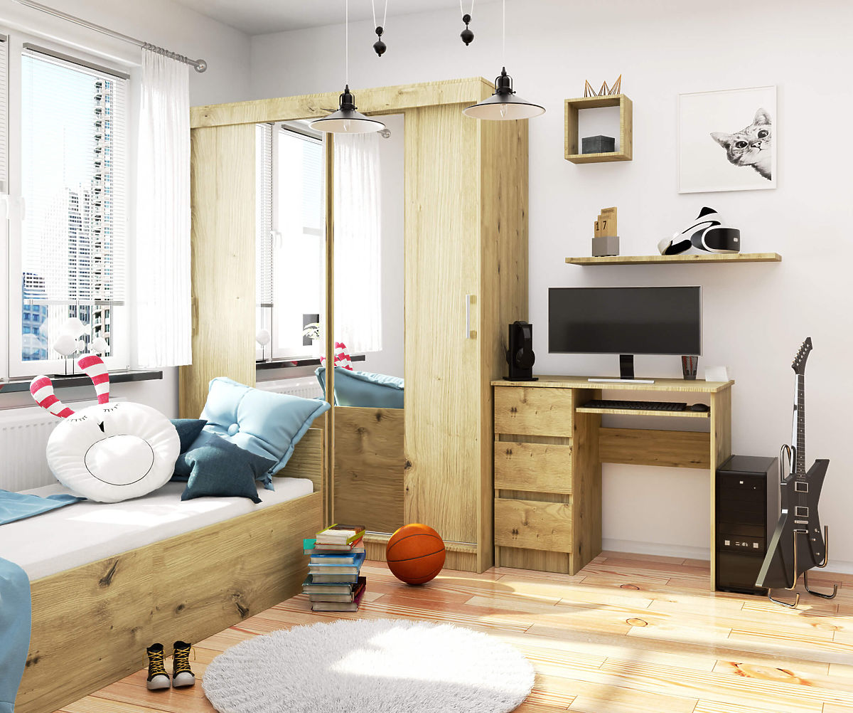 Biroul pentru calculator A-6 stejar artisan este perfect pentru camera copiilor și adolescenților, dar și pentru birou. Dimensiunile sale mici permit, de asemenea, amenajarea unui spațiu pentru studiu sau lucru de acasă în dormitor sau în camera de zi. Biroul este, de asemenea, ideal pentru birouri mici și confortabile. Datorită culorii stejar artisan, mobilierul se potrivește atât cu elemente de mobilier moderne, cât și clasice.