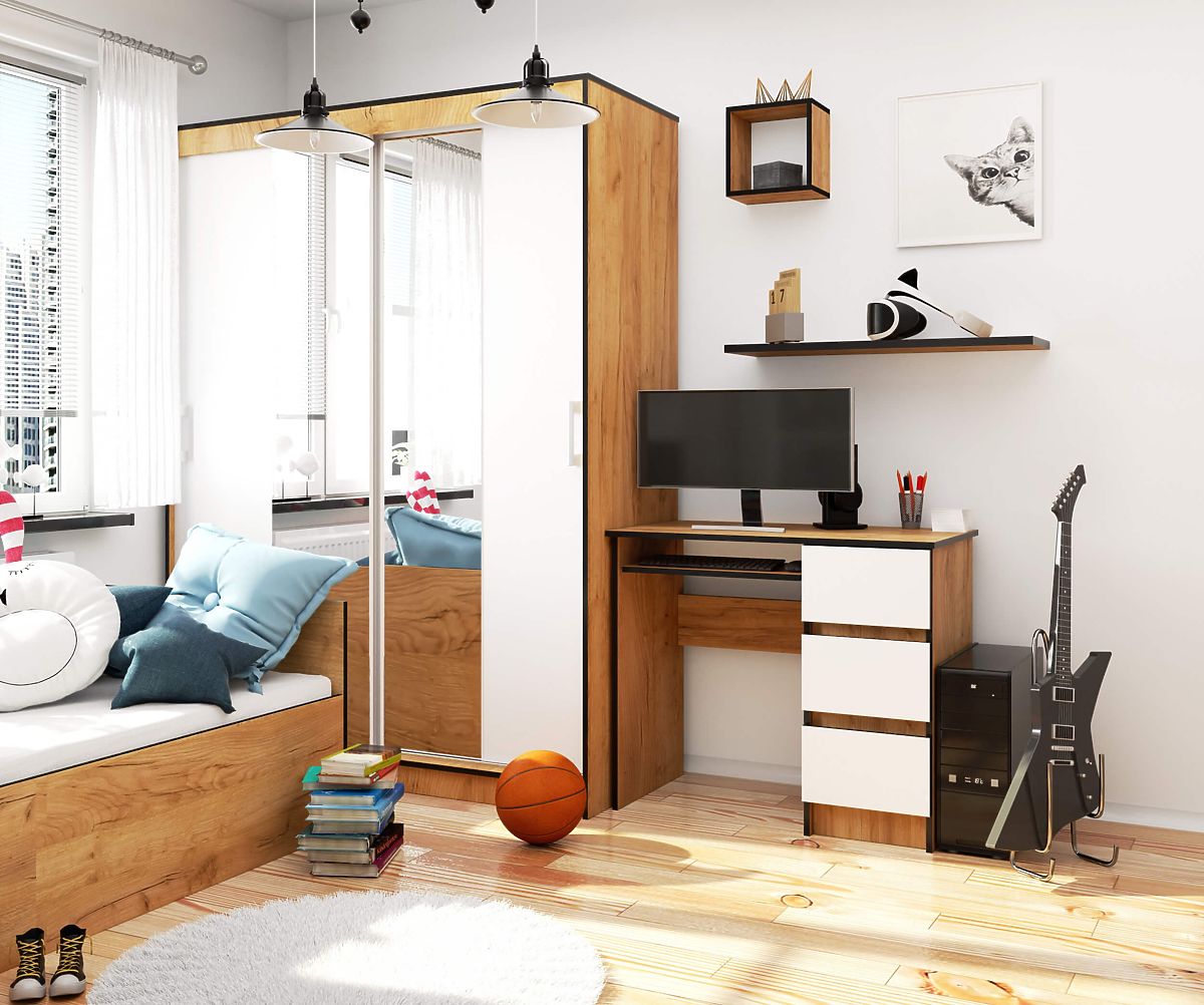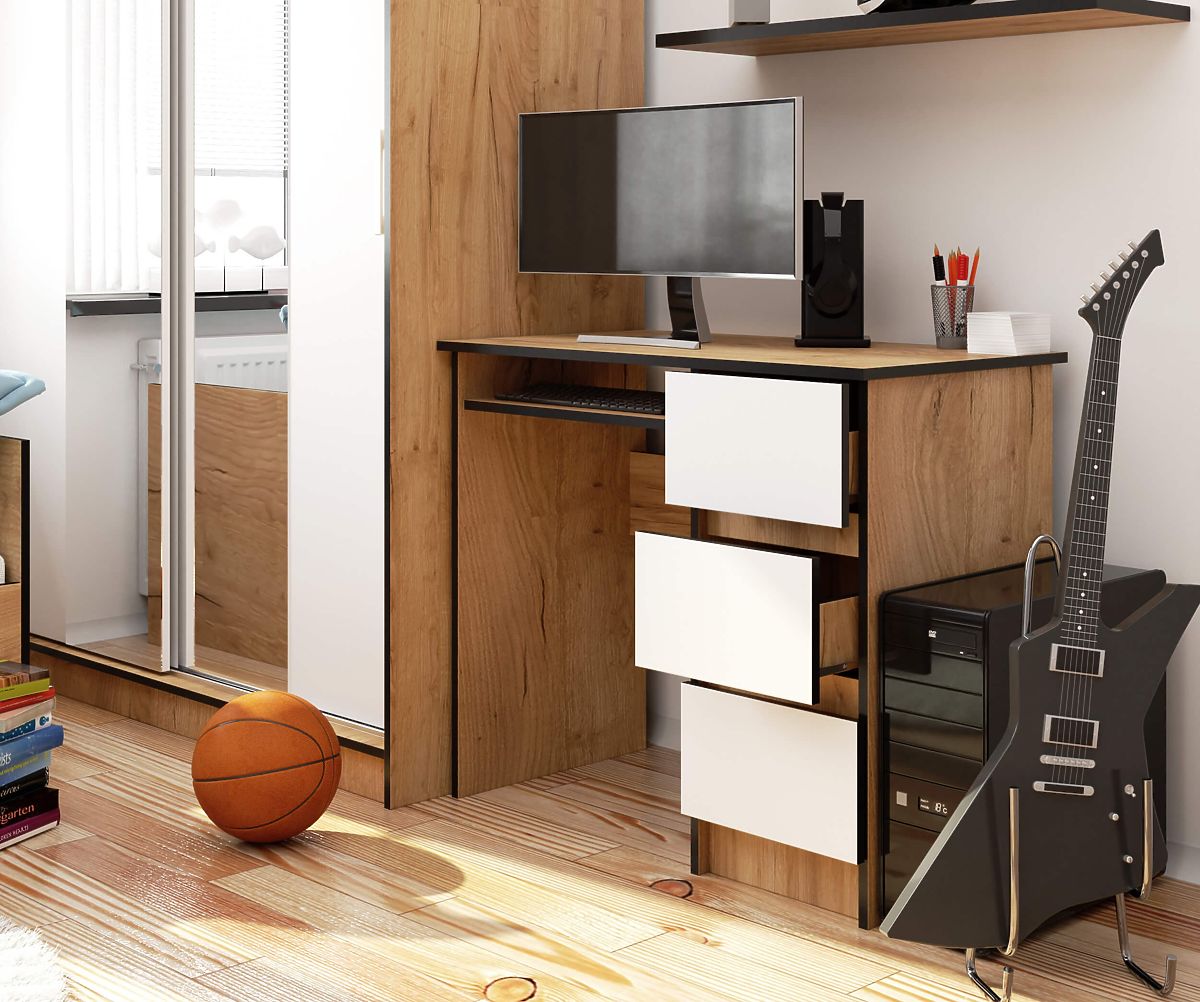Biroul A-6 cu lungimea de 90 cm în nuanța stejar craft cu fronturi albe se potrivește perfect atât în interiorul clasic, cât și în cel modern al camerei pentru copii sau tineret. Poate fi utilizat cu succes și ca parte a echipamentului unui birou de acasă. Totul depinde de nevoile și preferințele individuale ale utilizatorului. Datorită celor trei sertare practice, veți obține spațiu suplimentar de depozitare pentru diverse lucruri pe care doriți să le aveți la îndemână.