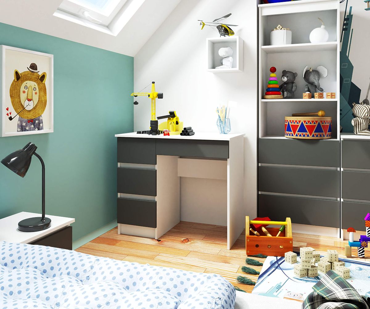 Birourile pentru computer devin o parte esențială a caselor noastre. Nu este de mirare, având în vedere cât timp petrecem în fața ecranului computerului, fie că învățăm sau lucrăm. Ce model de mobilier să alegem? O opțiune interesantă este biroul pentru computer A-7 de 90 cm stânga, de culoare albă, cu fațade în gri grafit. Se potrivește perfect în sufragerie, camera copiilor sau birou.
