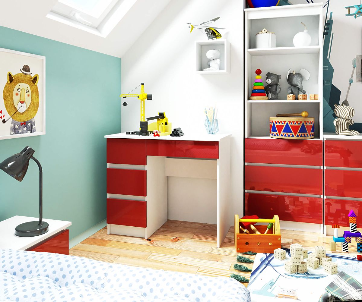 Culoarea neobișnuită a biroului atrage atenția, iar funcționalitatea sa asigură că acest produs va satisface așteptările chiar și celor mai pretențioși utilizatori. Mobilierul combină un corp alb și suprafețe frontale roșii lucioase, care fac biroul excepțional. Este o alegere potrivită pentru spații mici datorită dimensiunilor compacte ale construcției. Biroul pentru calculator A-7 de 90 cm (stânga) este compus din patru sertare. Este ideal pentru camerele copiilor și tineretului, dar și pentru birouri modern amenajate.