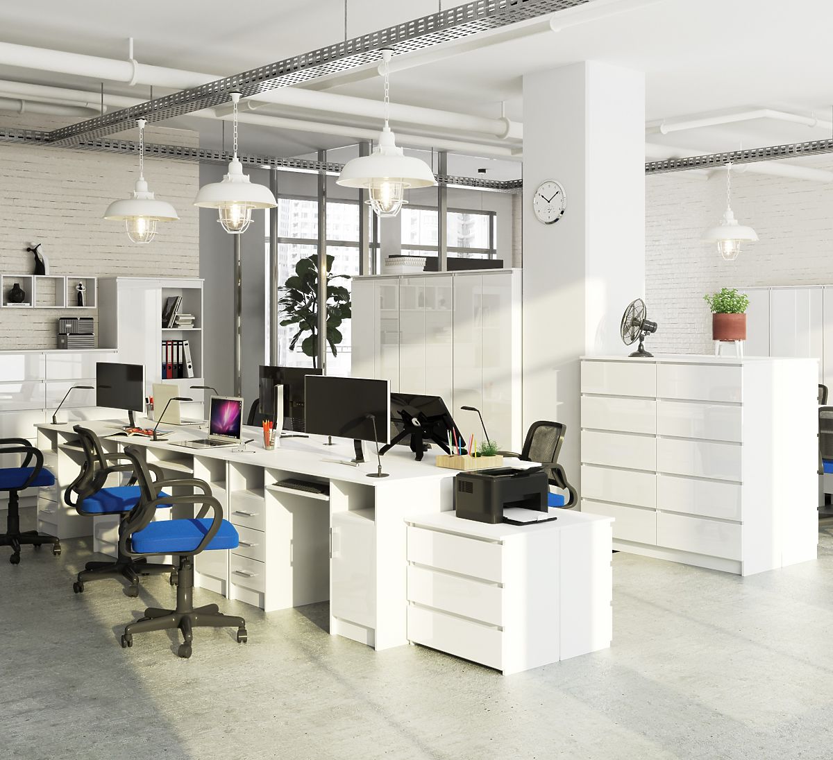 Biroul prezentat se remarcă prin forma sa simplă și aspectul elegant - ideal pentru cei care apreciază soluțiile funcționale și estetice. Mobilierul este realizat din placă laminată de înaltă calitate de 16 mm, care se caracterizează printr-o rezistență ridicată la abraziune. Marginile sale sunt acoperite cu o bandă ABS, ceea ce le sporește rezistența la deteriorare. O caracteristică interesantă este că fronturile sertarelor și ușilor sunt realizate din placă MDF cu luciu înalt - se caracterizează prin cel mai înalt standard posibil de luciu. Mobilierul este de culoare albă și are mânere argintii. Biroul conține trei sertare, două rafturi deschise și un raft cu ușă, oferind mult spațiu de utilizare. Acest lucru permite o bună organizare a muncii, deoarece accesoriile și echipamentele importante pot fi la îndemână. Dimensiunile biroului sunt 124 cm lungime, 74 cm înălțime și 52 cm adâncime. Mobilierul este destinat montajului individual. Instrucțiunile sunt incluse. Biroul se potrivește perfect atât în mediul de lucru, cât și acasă.