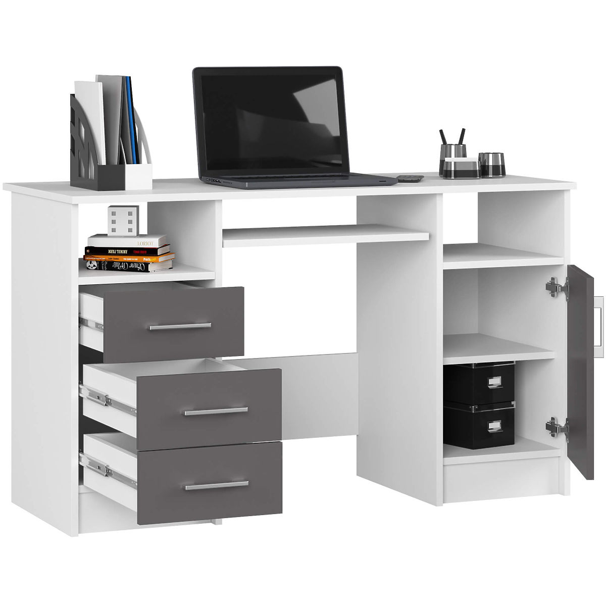 Biroul pentru computer ANA de 124 cm, datorită combinației clasice de alb și gri grafit, se integrează ușor în orice interior. A fost proiectat având în vedere spațiile de birou și studiourile. Este potrivit și pentru camera unui adolescent. Pe blatul biroului este mult spațiu – puteți plasa un monitor și alte obiecte de lucru necesare după cum este nevoie. Pentru tastatură există un raft extensibil separat. Biroul oferă mult spațiu pentru organizare: două nișe, trei sertare și un dulap cu raft. Întreaga construcție este realizată din placă laminată, ușor de întreținut și rezistentă la abraziune. Biroul ANA este eleganță, funcționalitate și soliditate într-unul.