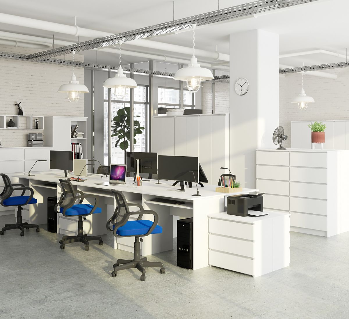 Birou independent! Partea din spate a biroului este finisată cu placă laminată, ceea ce permite amplasarea mobilierului oriunde, fără a fi necesară plasarea lângă perete.