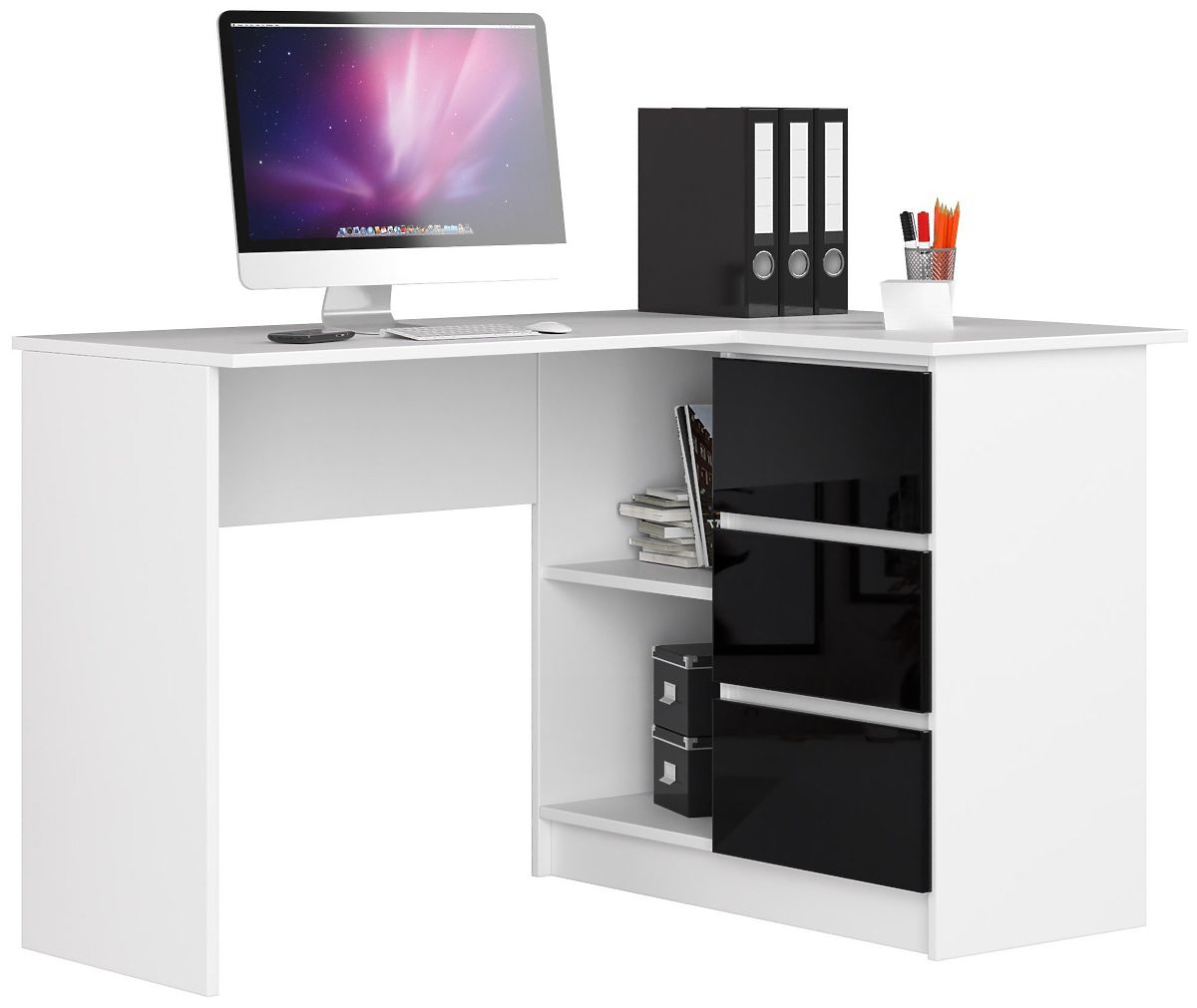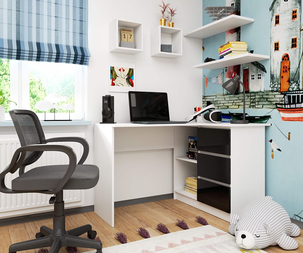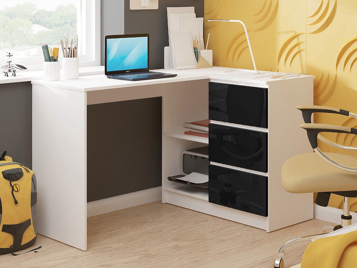 Banaby.ro » Mobilier pentru copii / Mese pentru copii / Birouri pentru copii / BIROU DE COLȚ B16 124 cm DREAPTA 3 SERTARE PK ALB / NEGRU LUCIOAS