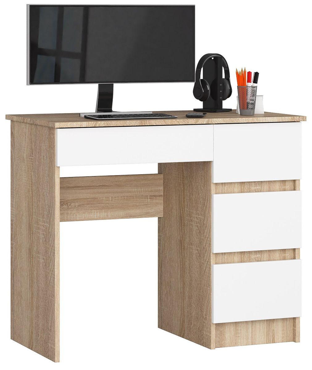 Un birou de calculator accesibil și de calitate, la care te poți învăța și lucra confortabil? Da, este posibil cu oferta magazinului nostru, unde găsiți biroul de calculator A-7 cu lățimea de 90 cm în sonoma dreaptă și culoare albă. Este un mobilier modern și funcțional. Se potrivește ideal în living, camera de zi, camera tineretului sau birou.