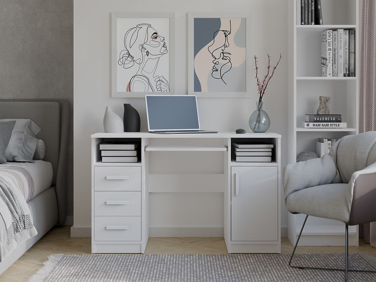 BIROU DELTA ALBĂ 120 cm 3 Sertare Dulap Rafturi Pentru Birou Cameră Laptop
