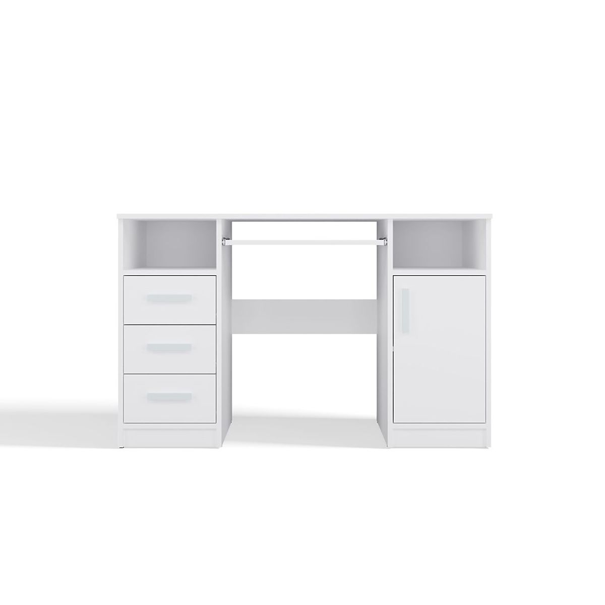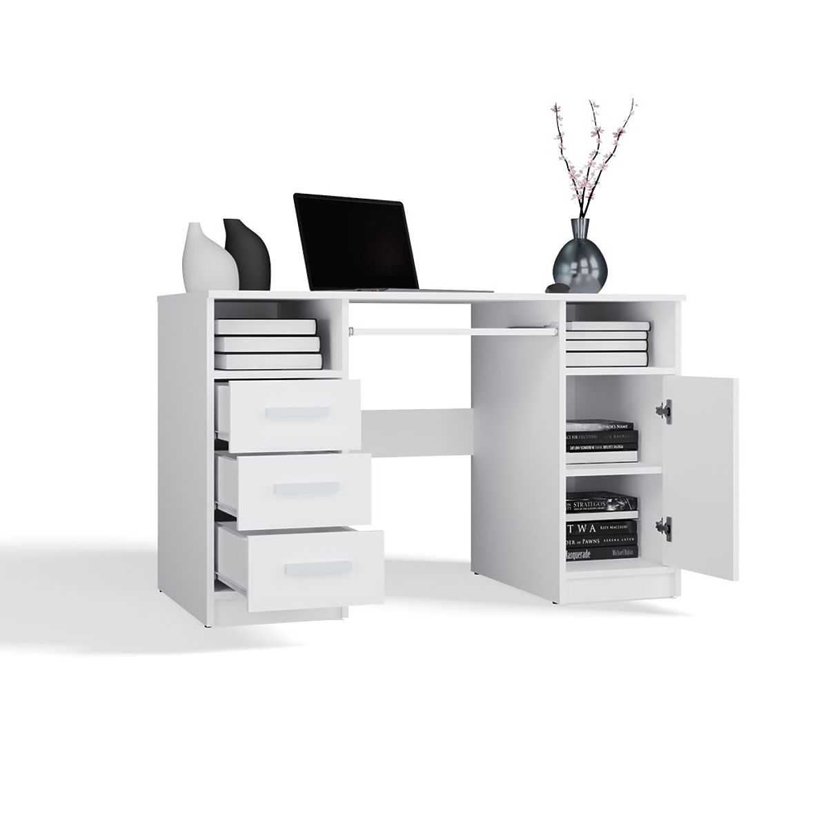Echipat cu 3 sertare și un dulap închis cu 1 ușă și 2 rafturi, oferă suficient spațiu de depozitare pentru documente, cărți sau rechizite de birou. În plus, sub blat este disponibil un raft extensibil pentru tastatură, facilitând utilizarea computerului.