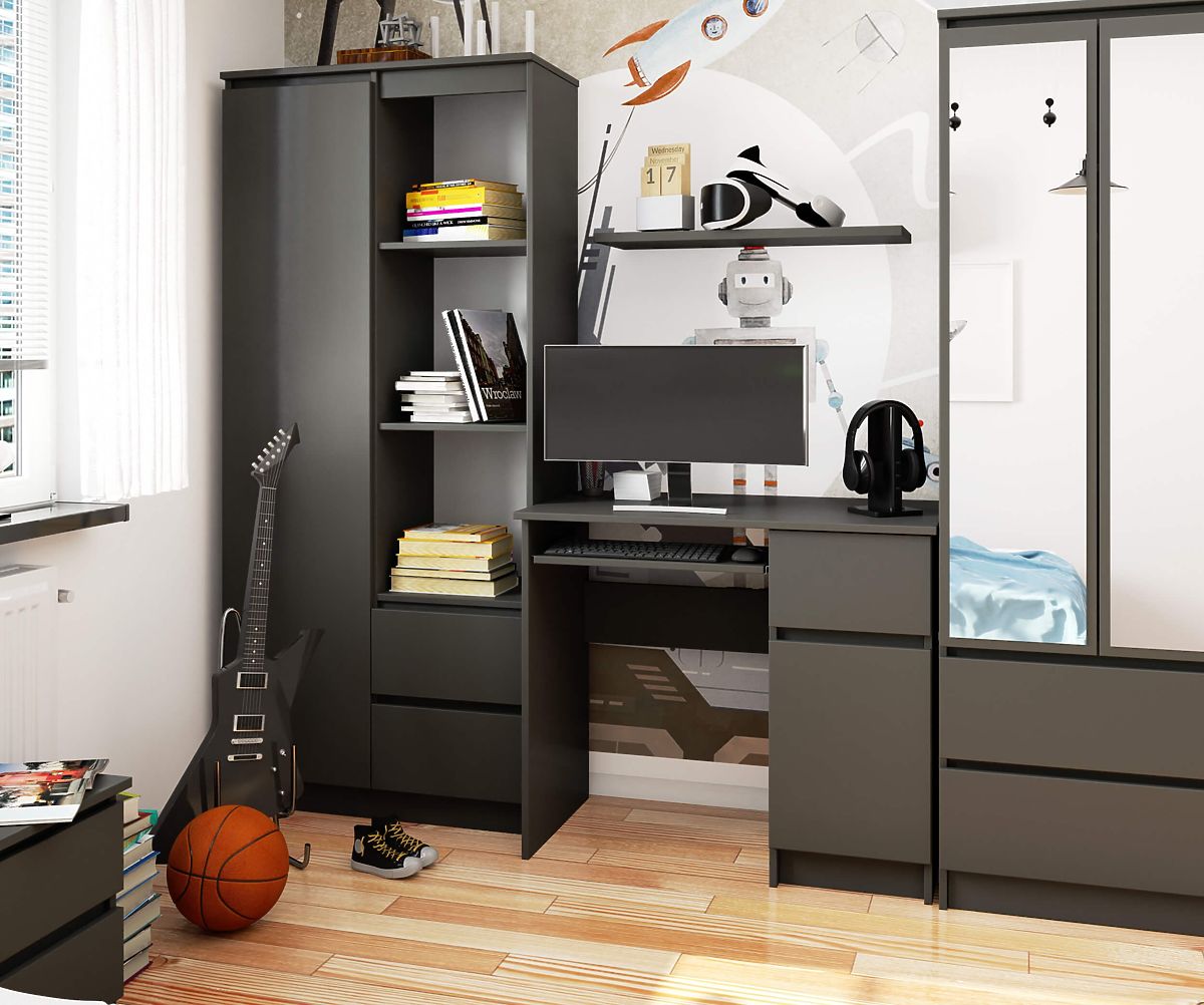 Masa independentă PIKSEL de 90 cm în culorile GRAFIT GRI este soluția ideală pentru interioare mici. Este foarte utilă ca masă de școală sau de calculator. Construcția sa ergonomică asigură confortul în utilizare. Masa este echipată cu un raft extensibil pentru tastatură, un sertar lateral practic și un dulap cu raft, în care se pot depozita cu ușurință dosare și cărți. Pentru fabricarea mesei s-a folosit un blat mat, plăcut la atingere și ușor de întreținut, acoperit cu un strat de laminat rezistent. Întregul este completat de mânere practice de culoare argintie.