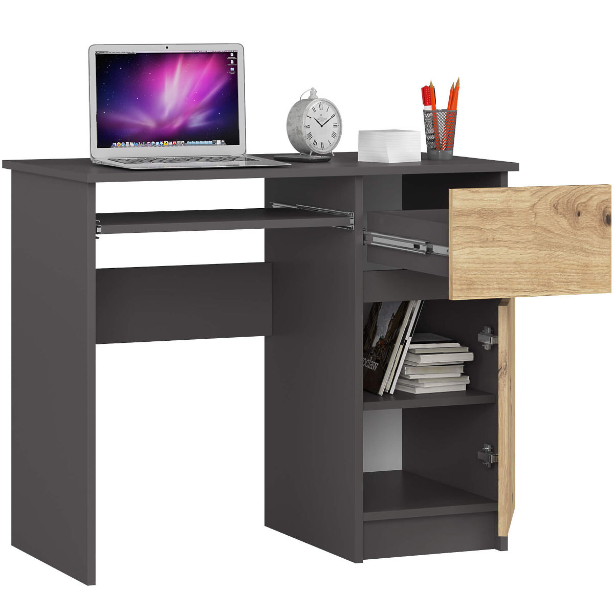 Masa PIKSEL de 90 cm în culorile GRI GRAFIT/STEJAR ARTISAN este soluția ideală pentru interioare mici. Este foarte potrivită ca masă de școală sau de calculator. Construcția sa ergonomică asigură confortul în utilizare. Masa este echipată cu un raft extensibil pentru tastatură, un sertar lateral practic și un dulap cu raft, care poate găzdui dosare și cărți. Pentru fabricarea mesei a fost folosit un blat mat, plăcut la atingere și ușor de întreținut, acoperit cu un strat de laminat rezistent la abraziune. Întregul este completat de mânere practice de culoare argintie.