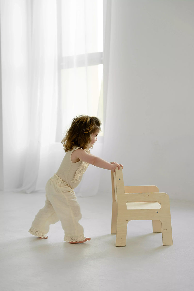 Scaunul din lemn pentru copii este proiectat pentru copii de diferite vârste – potrivit atât pentru un copil de un an care descoperă lumea, cât și pentru un preșcolar creativ. Oferă un suport solid pentru spate și, în același timp, asigură o ședere confortabilă în timpul jocului, desenului sau mesei. Este ideal și în bucătărie sau baie – copilul poate să se ridice pe șezut și să ajungă ușor la blatul de lucru sau la chiuvetă. Toate marginile sunt atent rotunjite pentru a asigura siguranța maximă a micilor utilizatori.