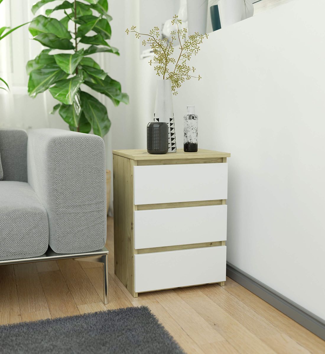 Comodă cu 3 sertare, stejar artisan și alb, pentru dormitor. .. mai mult