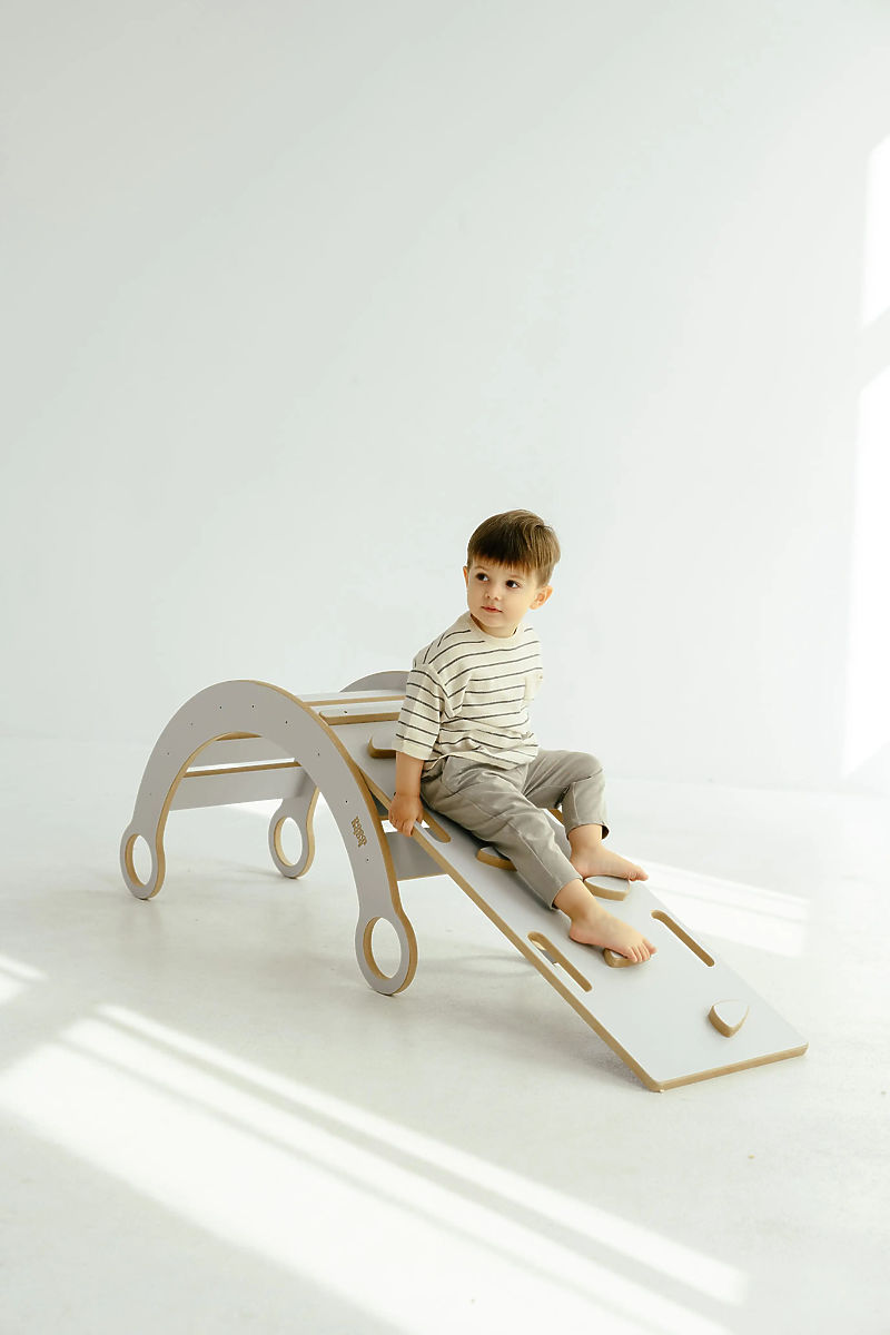 Leagănul Montessori din lemn cu tobogan și perete de cățărare în culoarea albă este ideal pentru orice cameră de joacă pentru copii. Acest leagăn nu doar că oferă o distracție plăcută de balansare, dar și posibilitatea de cățărare și alunecare pe tobogan, dezvoltând astfel abilitățile motorii, echilibrul și forța copiilor.