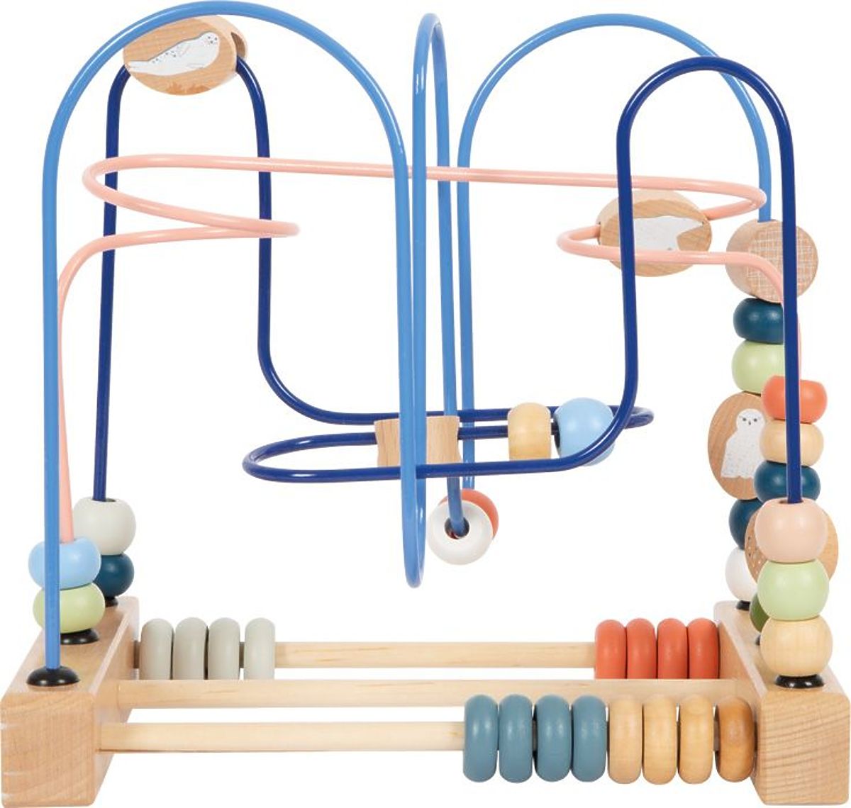 Pe trei tije metalice colorate (albastru închis, roz și albastru) sunt mărgele de lemn pe care copilul le poate muta liber, exersând astfel precizia mișcărilor degetelor și mâinilor. Pe bucle sunt, de asemenea, 3 cuburi cu imagini ale animalelor arctice: bufnița de zăpadă, ursul polar alb și focă albă. La baza circuitului sunt 2 șine cu mărgele colorate mobile pentru a învăța numărarea.