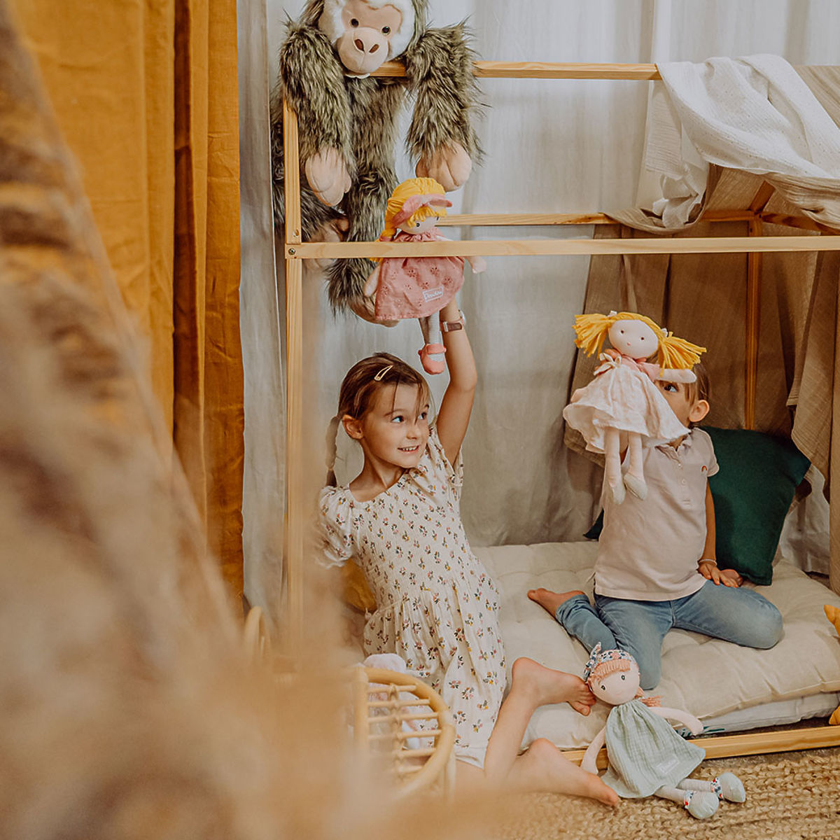 Păpușa din material textil Suzette este adesea visătoare și îi place să se cufunde în povești minunate. Îi place să poarte rochii roz frumoase și fluide din bumbac, împodobite cu broderii florale, balerini roz și o bentiță cu o fundă mare cu un strop de tul. Îmbrăcămintea poate fi dezbrăcată și îmbrăcată din nou. Păpușa este livrată într-o cutie cadou originală. Jucăria respectă standardele europene de siguranță CE. Întreținere: Spălați la 30° Recomandare: Uscare naturală sau la temperatură scăzută. Caracteristici principale: potrivită de la naștere, față din bumbac, ochi și gură brodate și pistrui, păpușă cu accesorii care pot fi dezbrăcate și îmbrăcate, în cutie cadou
