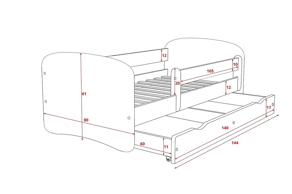 - Patul copilului, inclusiv reținerea, este confecționat din blat laminat de înaltă calitate de 18 mm.