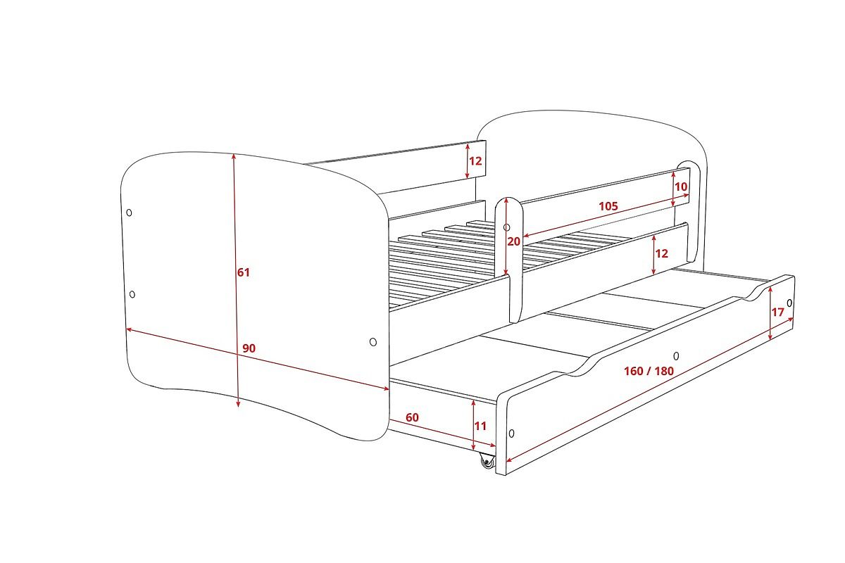 Patul este realizat pe două fețe - în timpul asamblării alegeți de ce parte se vor afla sertarul și bariera variabilă.