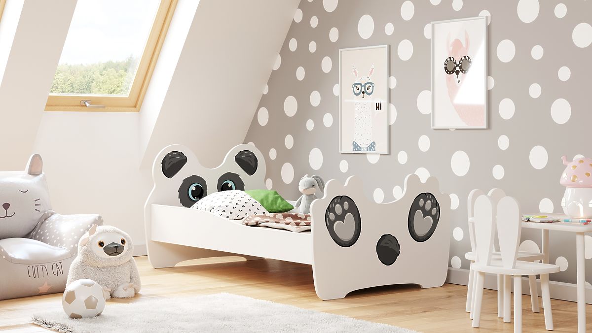 Patul pentru copii cu un imprimeu adorabil de panda este soluția ideală pentru o mică iubitoare de motive de basm. Modelul drăguț de pe capătul și picioarele patului transformă această piesă de mobilier nu doar într-un loc de dormit, ci și într-o decorațiune excepțională pentru camera copilului. Culorile delicate și motivul de basm aduc o atmosferă veselă în interior, care sprijină atât odihna, cât și jocul creativ.