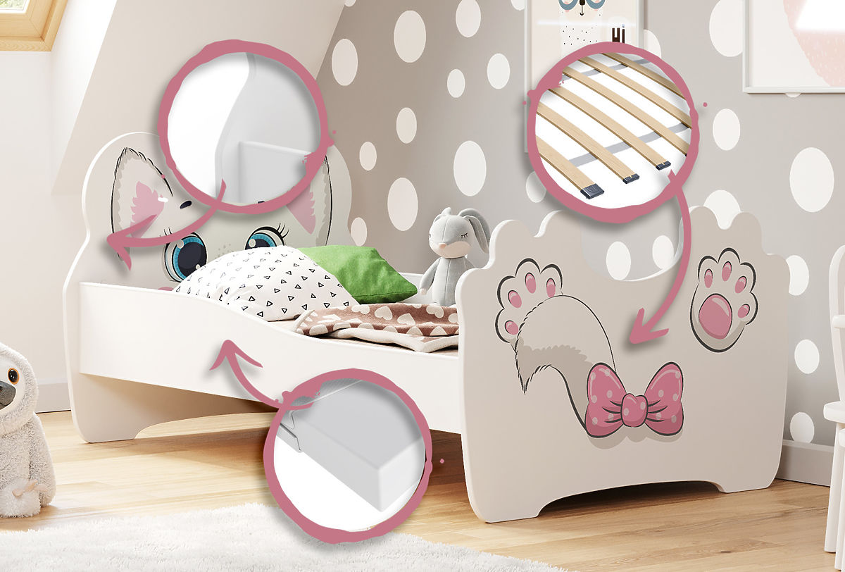 Patul pentru copii cu imprimeu adorabil de pisicuță roz este soluția ideală pentru o mică iubitoare de motive de basm. Modelul drăguț de pe tăblia și partea de la picioare a patului transformă mobilierul nu doar într-un loc de dormit, ci și într-o decorațiune excepțională pentru camera copilului. Culorile delicate și motivul de basm aduc o atmosferă veselă în interior, care sprijină atât odihna, cât și jocul creativ.