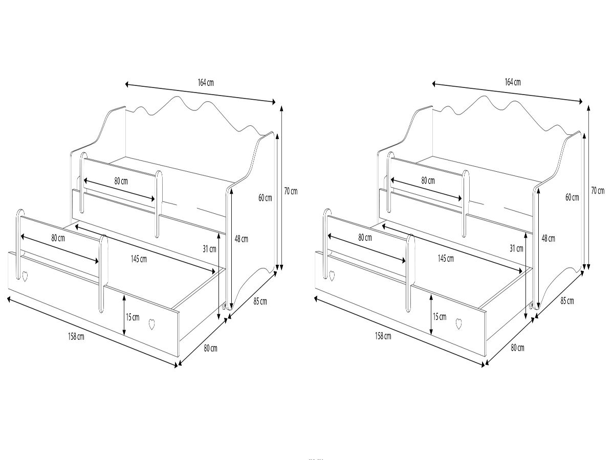 Patul pentru copii Kobi Emma este soluția ideală pentru părinții care caută mobilier practic și estetic pentru camera copiilor. Acest model are două suprafețe de dormit - superioară de 160x80 cm și inferioară de 145x80 cm - ceea ce îl face o alegere excelentă atât pentru frați, cât și pentru copiii care își invită prietenii la dormit. Detaliile fine și designul bine gândit asigură că patul se integrează armonios în orice interior și devine o podoabă a acestuia.
