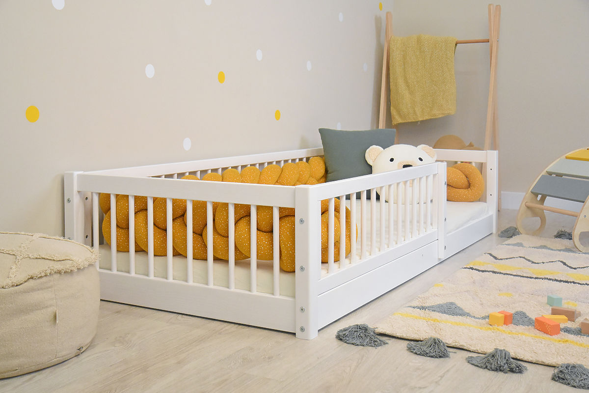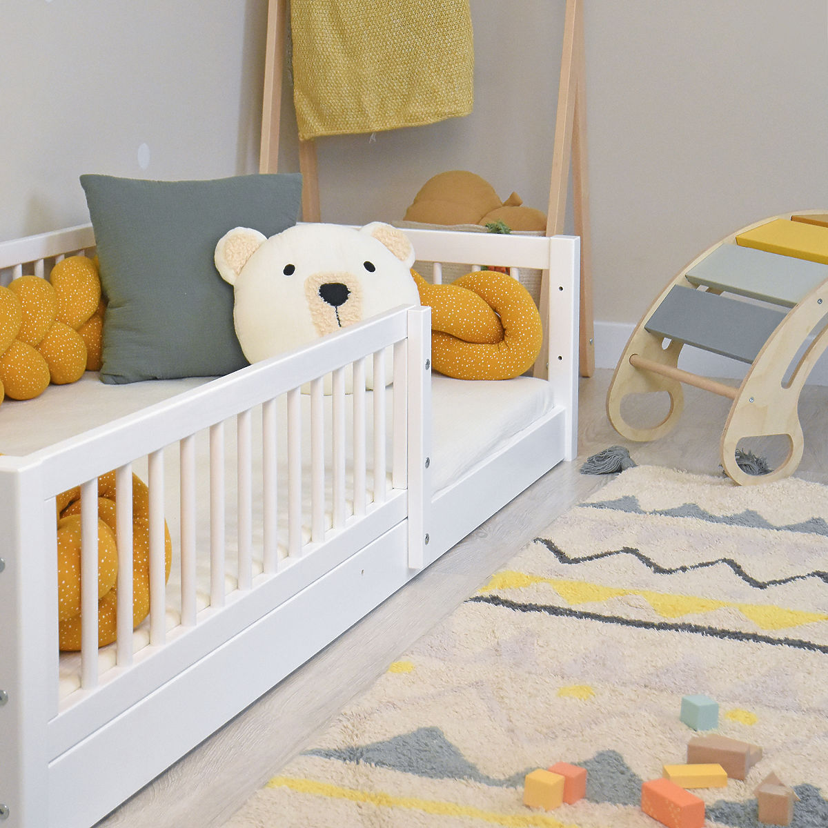 Patul Montessori în culoare albă elegantă este proiectat ținând cont de nevoile copiilor mici și de principiile pedagogiei Montessori. Datorită construcției joase, permite copilului accesul independent și sigur la pat fără ajutorul adulților, promovând astfel independența și încrederea în sine.