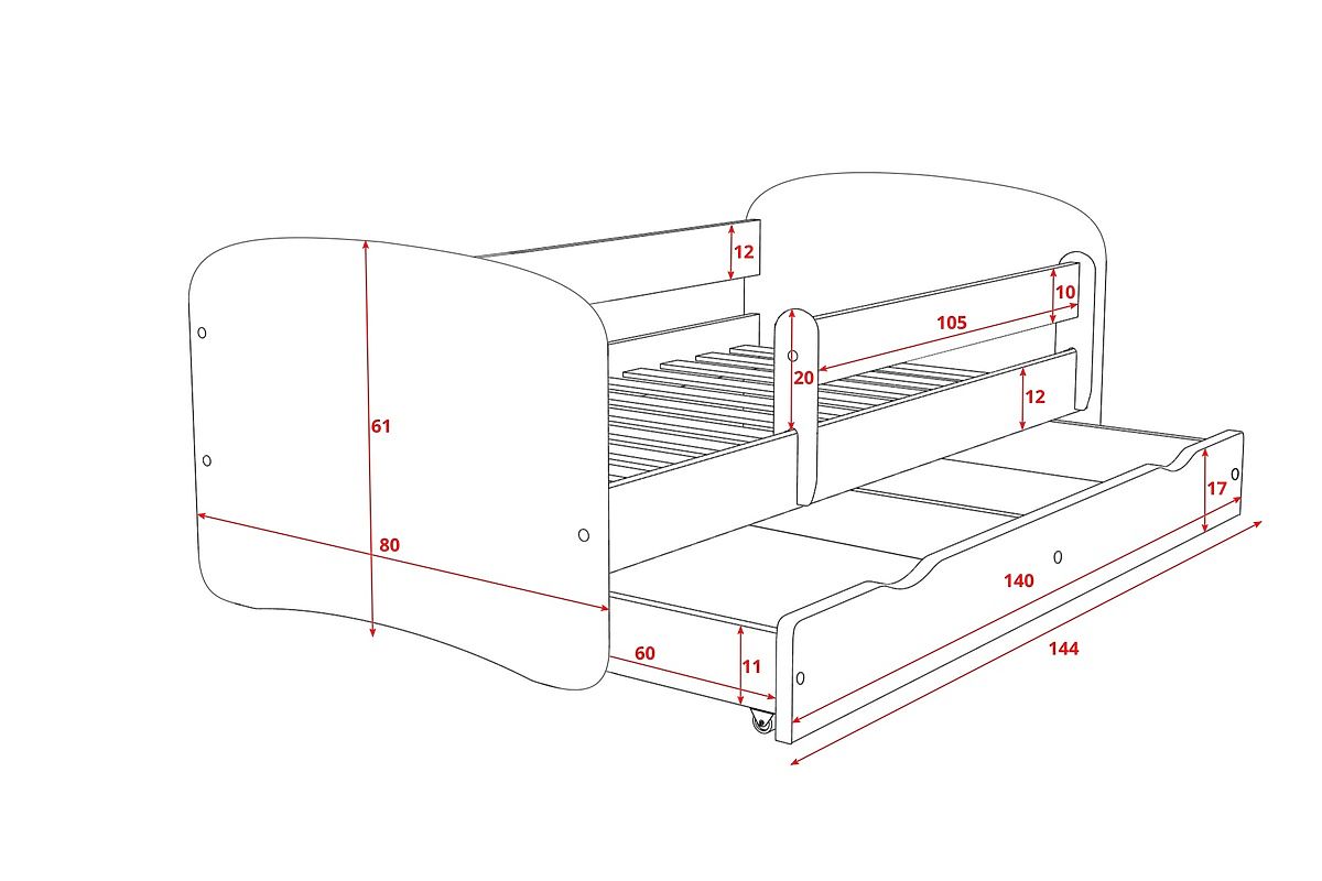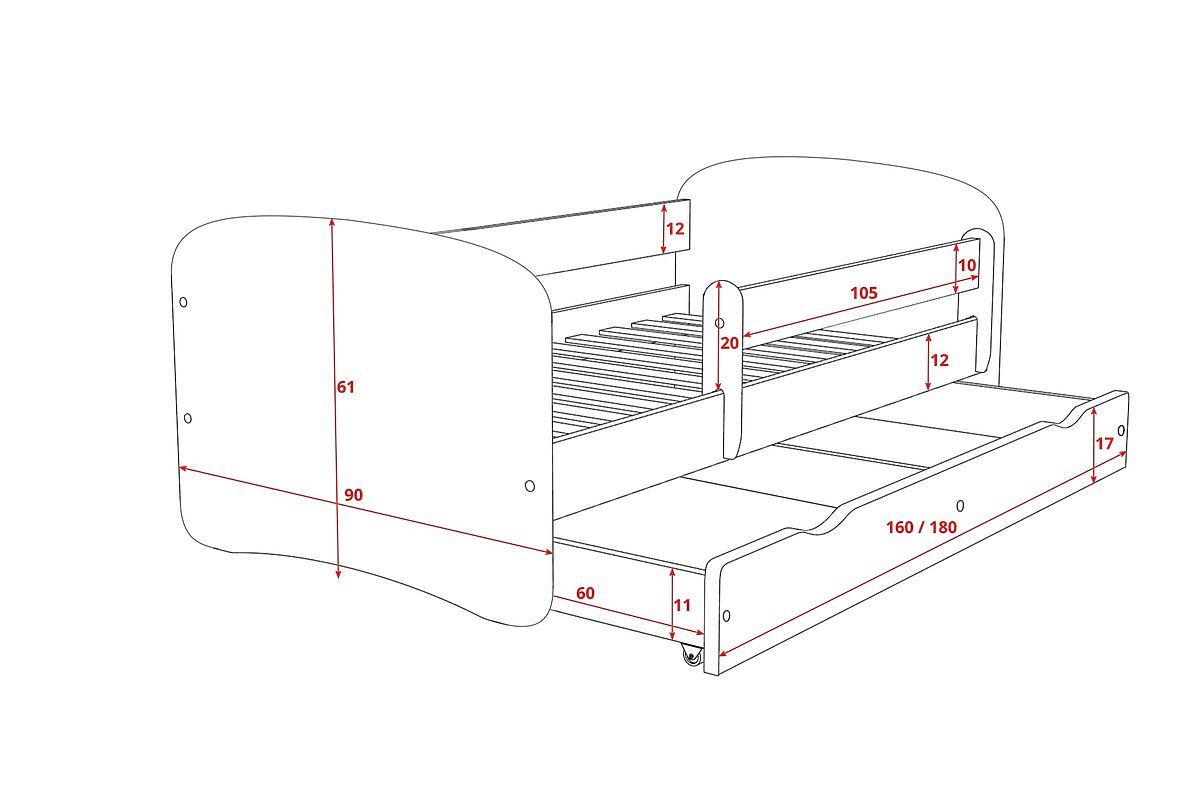 Este inclusă o sina detasabila care poate fi folosita pe ambele parti ale patului. Patul este un spatiu multi-functional, care poate fi folosit pentru joaca, sau pentru somn.