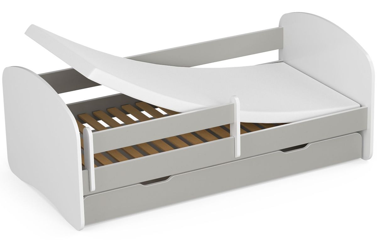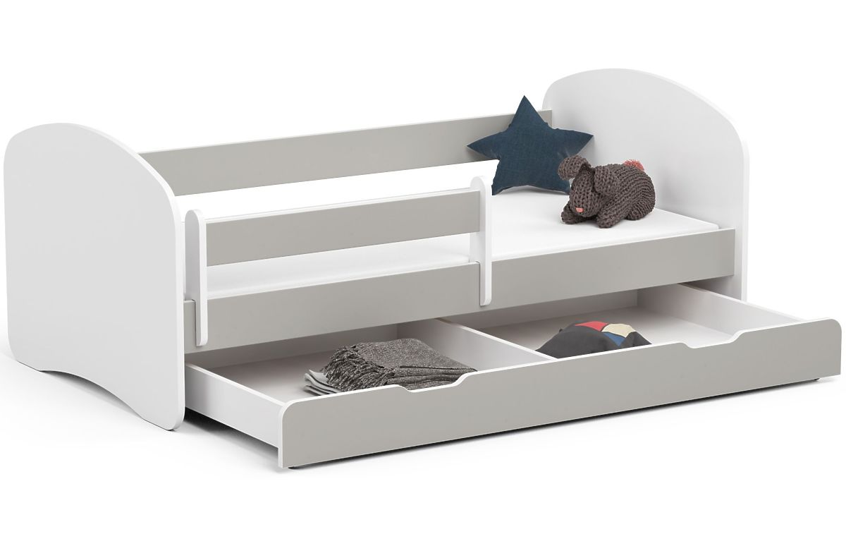 Patul SMILE cu dimensiunile de 160x80 cm, cu saltea, sertar și barieră. Un pat complet pentru băieți sau fete în camera copiilor. Culoare gri. Cadrul poate suporta o greutate de până la 100 kg.