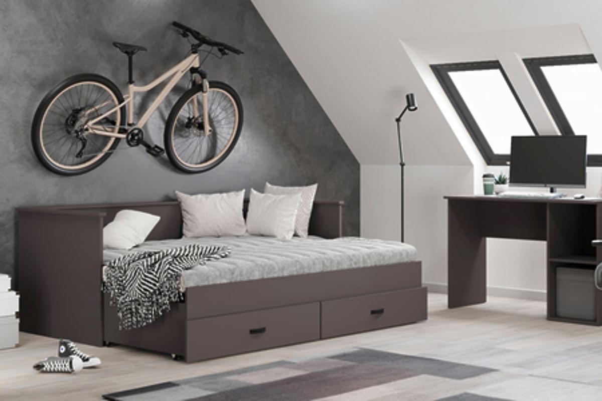 Patul HELIOS este un pat modern extensibil pentru tineret, care combină un aspect elegant cu funcții practice. Datorită posibilității de extindere rapidă într-un pat dublu prin glisarea bazei inferioare, acest mobilier este ideal atât pentru camere mici, cât și pentru cele spațioase. Designul său universal în culoarea gri se potrivește perfect în orice stil de interior, oferindu-i un caracter modern și o eleganță subtilă.