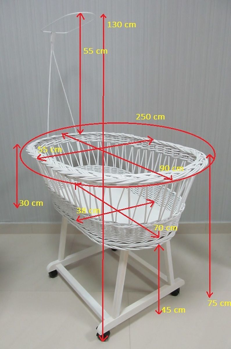 Coșul este împletit manual din răchită naturală și completat cu căptușeală moale, pernă, pătură și cearșaf. Un șasiu din lemn stabil asigură mutarea sigură și ușoară a coșului după nevoie.