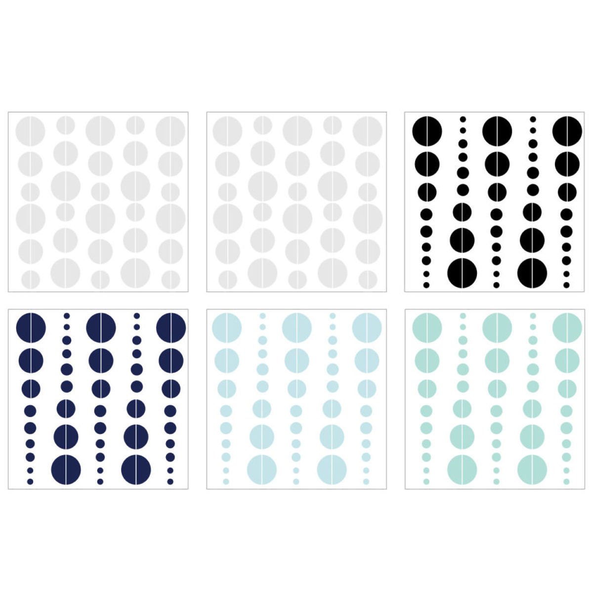 Decorarea de perete cu jumătăți de lună este împărțită în șase coli: 2x gri, 1X albastru, 1X albastru deschis, 1X mentă și 1X negru. Lunile gri semilună sunt pe ambele foi 120 bucăți, negru, albastru închis, albastru deschis și mentă sunt 30 de bucăți. Împreună, este posibil să se creeze o mulțime de combinații de culori.