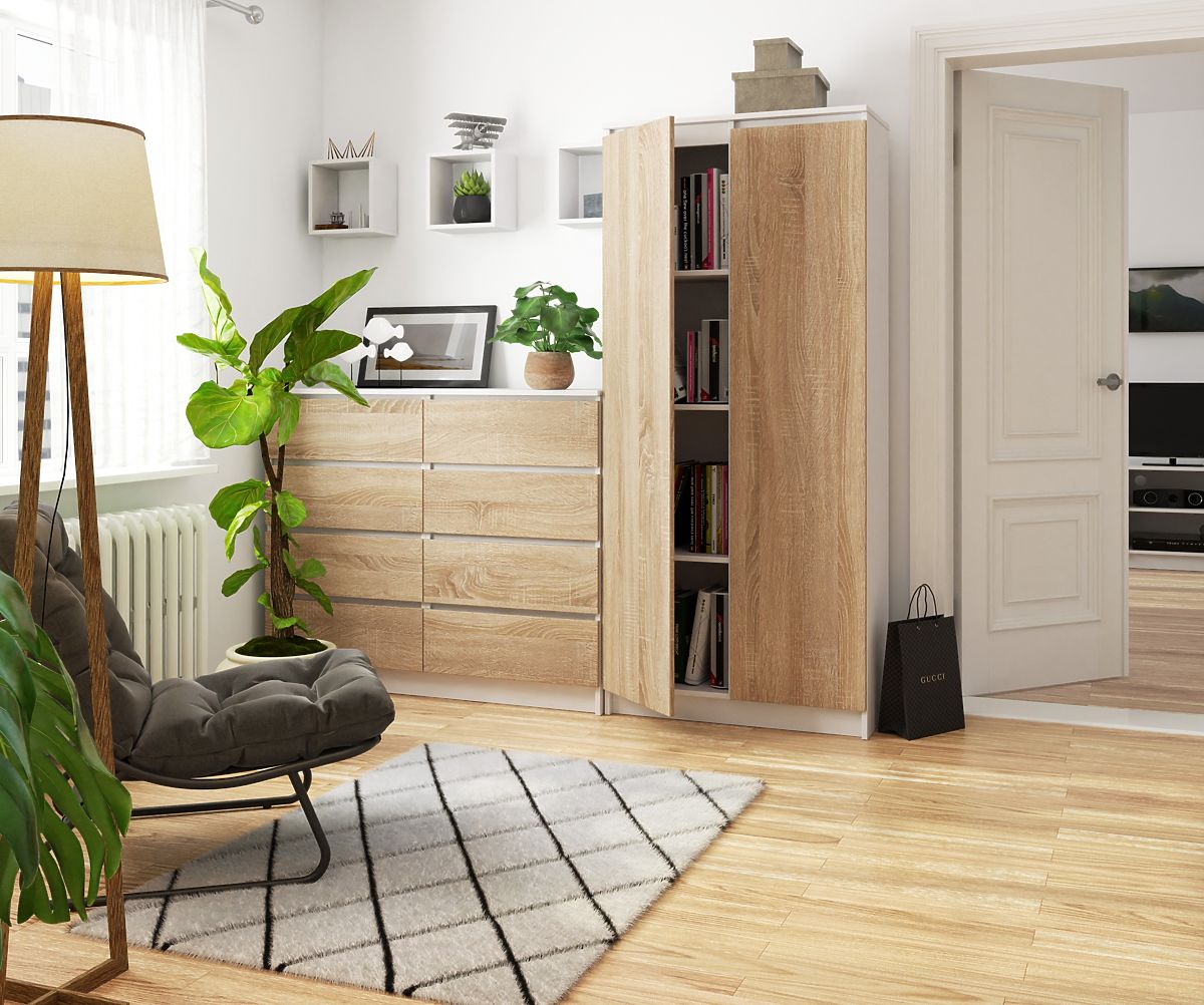 Dulapul de birou R 80 cm Clip 2 este un mobilier în culorile alb/sonoma, una dintre cele mai populare culori ale acestui sezon. Această bibliotecă va aduce ordine și armonie în biroul dumneavoastră. Este echipată cu opt rafturi spațioase, în care puteți depozita toate lucrurile necesare în birou. În plus, marginile sale sunt acoperite cu bandă ABS, care oferă o protecție ridicată împotriva deteriorării. Printre avantajele acestei biblioteci se numără: